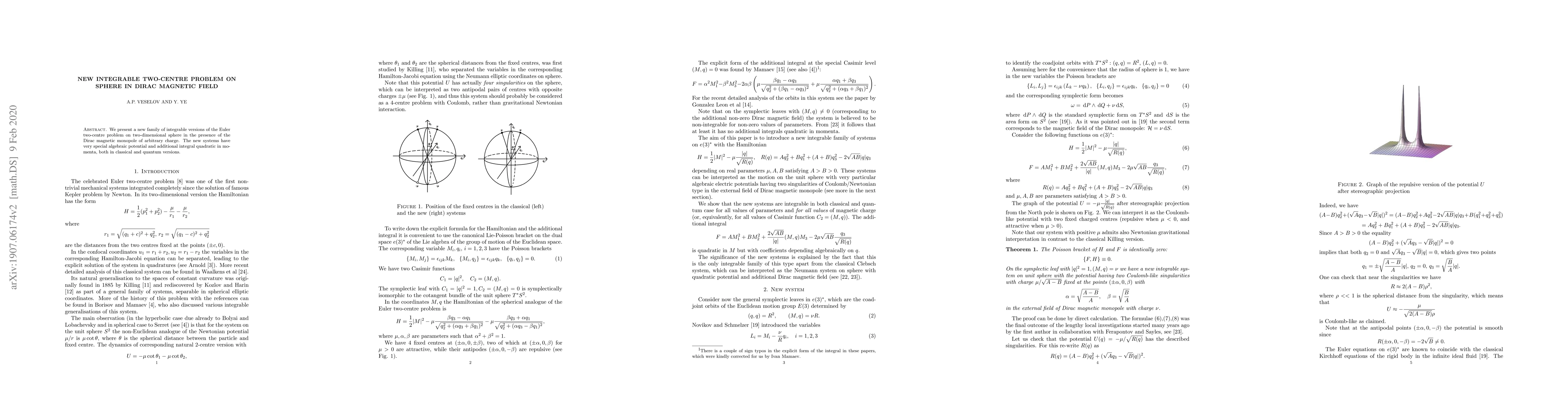 We present a new family of integrable versions of the Euler two-centre problem on two-dimensional sphere in the presence of the Dirac magnetic monopole of arbitrary charge. The new systems have very special algebraic potential and additional integral quadratic in momenta, both in classical and quantum versions.
