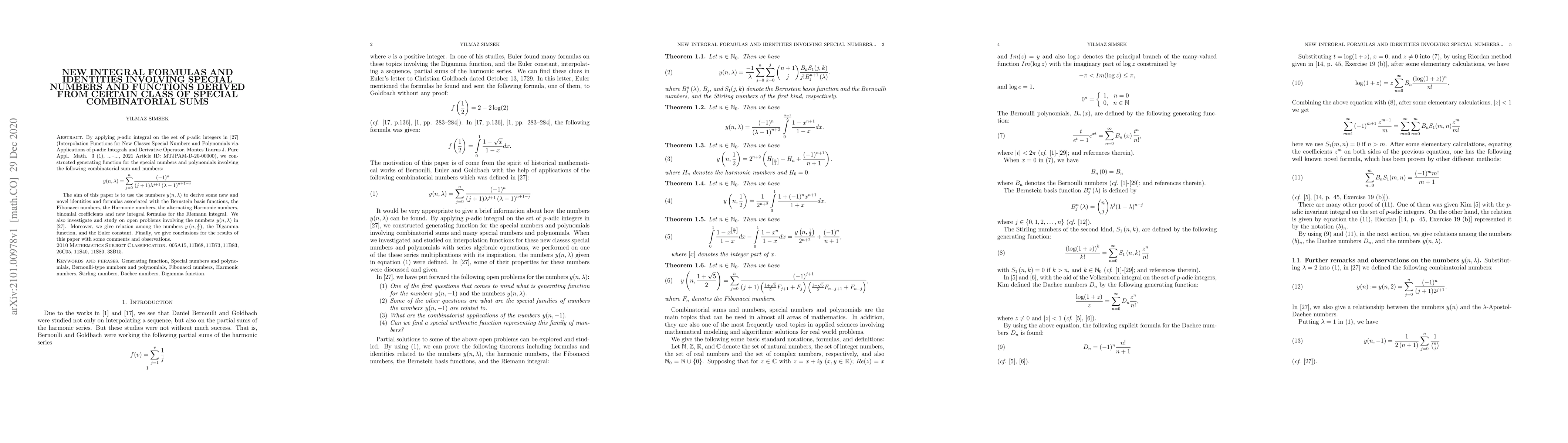 By applying p-adic integral on the set of p-adic integers in [27] (Interpolation Functions for New Classes Special Numbers and Polynomials via Applications of p-adic Integrals and Derivative Operator, Montes Taurus J. Pure Appl. Math. 3 (1), ...--..., 2021 Article ID: MTJPAM-D-20-00000), we constructed generating function for the special numbers and polynomials involving the following combinatorial sum and numbers: y(n,\lambda )=\sum_{j=0}^{n}\frac{(-1)^{n}}{(j+1)\lambda ^{j+1}\left(\lambda -1\right) ^{n+1-j}} The aim of this paper is to use the numbers y(n,{\lambda}) to derive some new and novel identities and formulas associated with the Bernstein basis functions, the Fibonacci numbers, the Harmonic numbers, the alternating Harmonic numbers, binomial coefficients and new integral formulas for the Riemann integral. We also investigate and study on open problems involving the numbers y(n,{\lambda}) in [27]. Moreover, we give relation among the numbers y(n,(1/2)), the Digamma function, and the Euler constant. Finally, we give conclusions for the results of this paper with some comments and observations.
