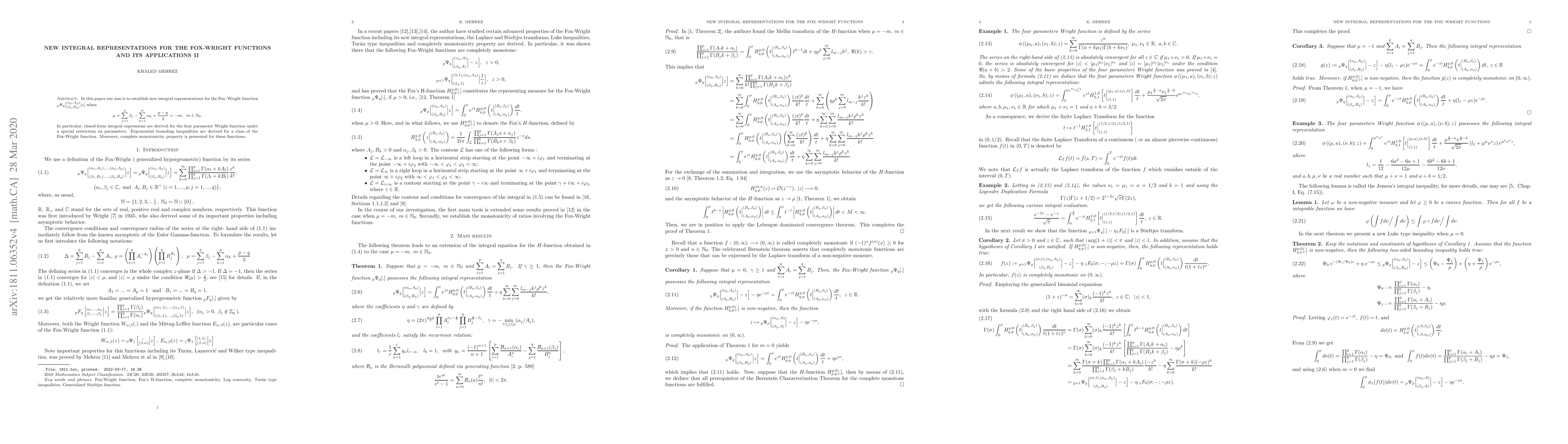 This paper presents new integral representations for the Fox-Wright function under specific parameter constraints, deriving closed-form expressions and exponential bounding inequalities. Additionally, it explores the complete monotonicity properties of these functions.