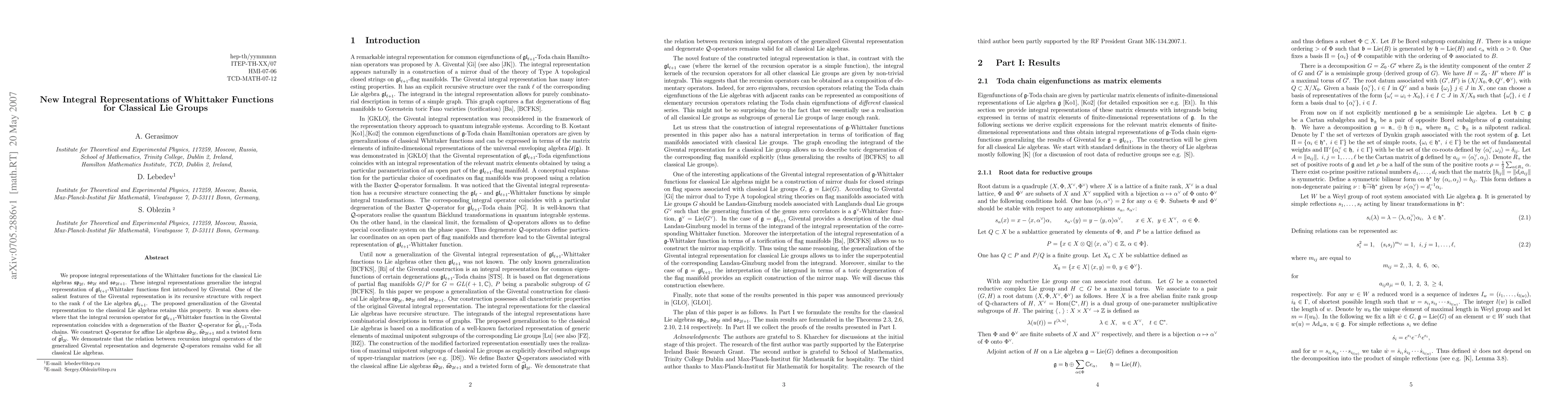This paper proposes new integral representations for Whittaker functions associated with classical Lie algebras, extending Givental's integral representation for gl(l+1). The generalization maintains the recursive structure and connects the integral recursion operators to degenerate Baxter Q-operators for affine Lie algebras.