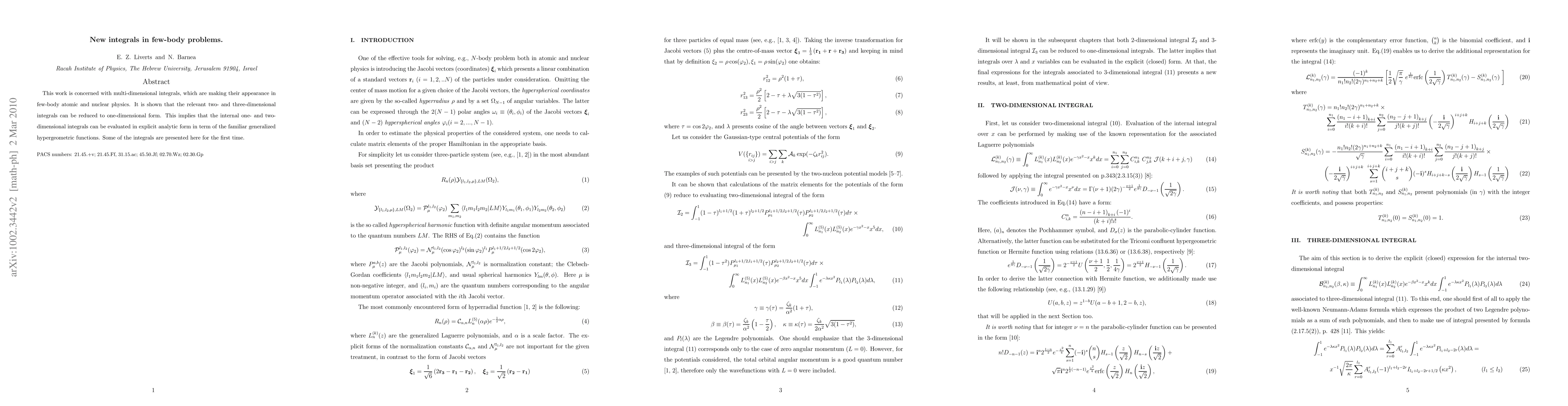 The paper introduces new explicit analytic representations for multi-dimensional integrals in few-body problems, utilizing generalized hypergeometric functions.