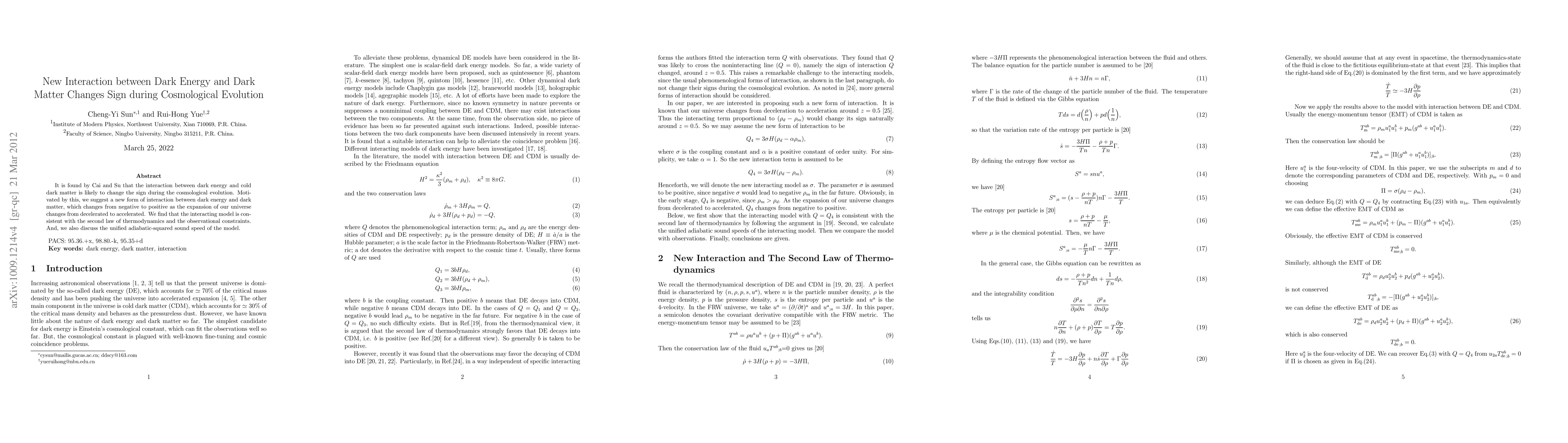Summary: This paper proposes a new interaction model between dark energy and dark matter, suggesting that the interaction changes from negative to positive as the universe transitions from deceleration to acceleration, consistent with thermodynamic laws and observational data. The model also discusses the unified adiabatic-squared sound speed.