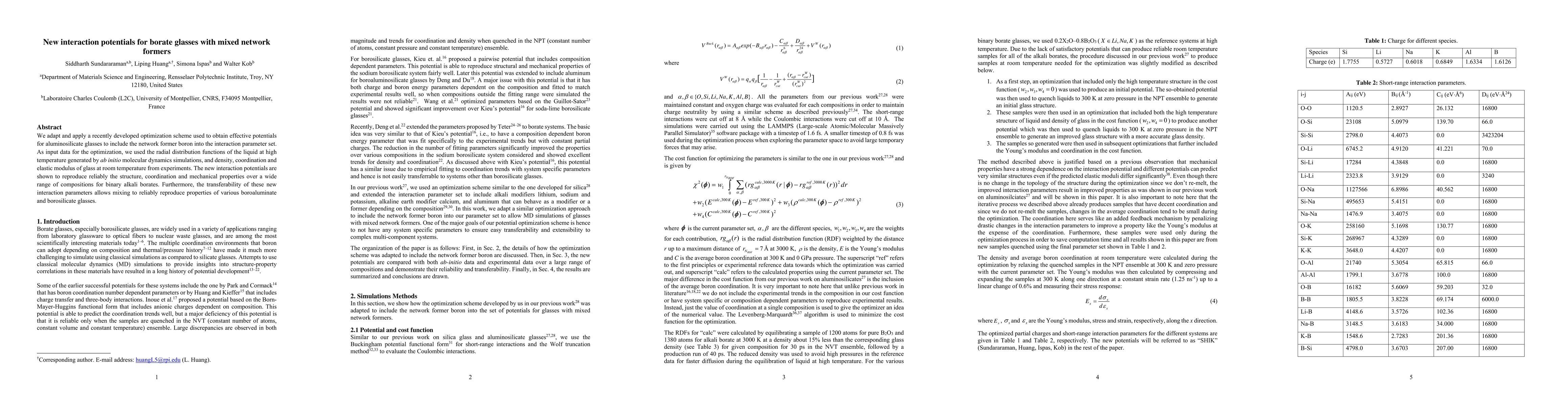 The paper develops new interaction potentials for borate glasses with mixed network formers using an optimization scheme, successfully reproducing structural, coordination, and mechanical properties across a range of binary alkali borates and demonstrating transferability for boroaluminate and borosilicate compositions.