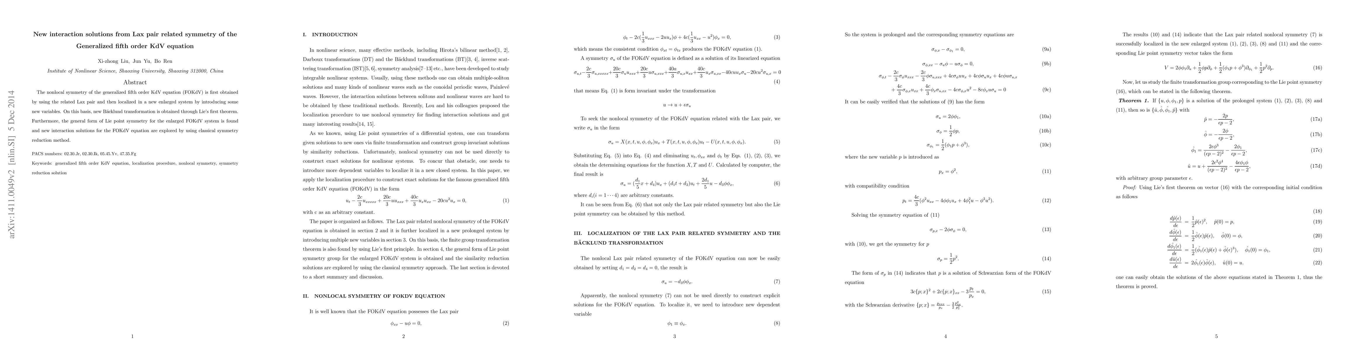 This research derives the nonlocal symmetry of the generalized fifth order KdV equation (FOKdV) via its related Lax pair, localizes it in an enlarged system, and uses Lie's first theorem to obtain a new Bäcklund transformation. It further explores new interaction solutions for the FOKdV equation through symmetry reduction methods.