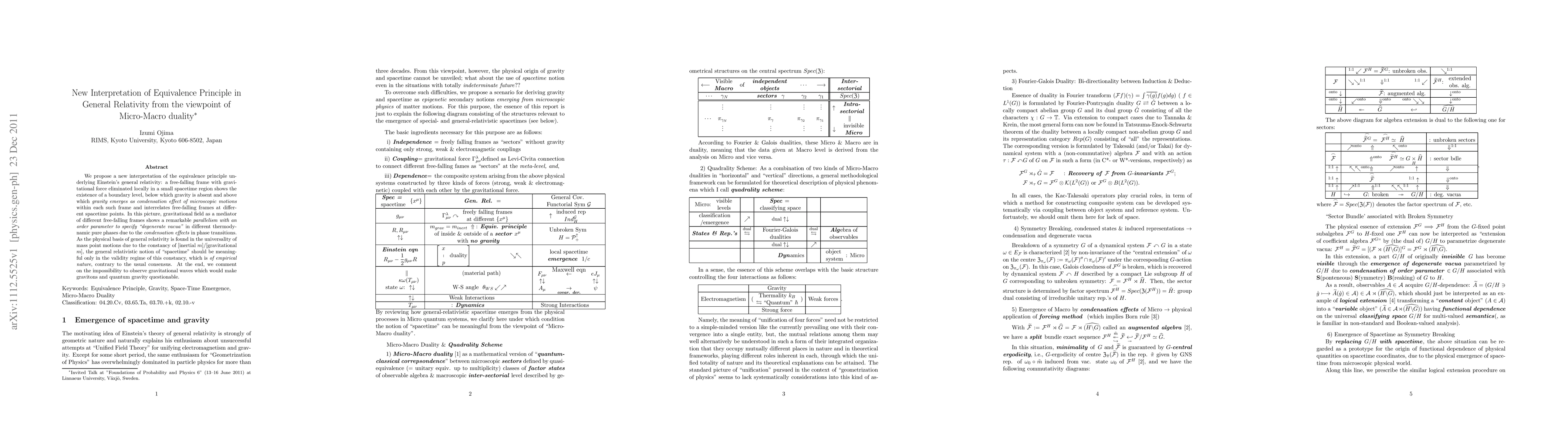 We propose a new interpretation of the equivalence principle underlying Einstein's general relativity: a free-falling frame with gravitational force eliminated locally in a small spacetime region shows the existence of a boundary level, below which gravity is absent and above which \textit{gravity emerges as condensation effect of microscopic motions} within each such frame and interrelates free-falling frames at different spacetime points. In this picture, gravitational field as a mediator of different free-falling frames shows a remarkable \textit{parallelism with an order parameter to specify "degenerate vacua"} in different thermodynamic pure phases due to the \textit{condensation effects} in phase transitions. As the physical basis of general relativity is found in the universality of mass point motions due to the constancy of [inertial $m$]/[gravitational $m$], the general relativistic notion of "spacetime" should be meaningful only in the validity regime of this constancy, which is \textit{of empirical nature}, contrary to the usual consensus. At the end, we comment on the impossibility to observe gravitational waves which would make gravitons and quantum gravity questionable.