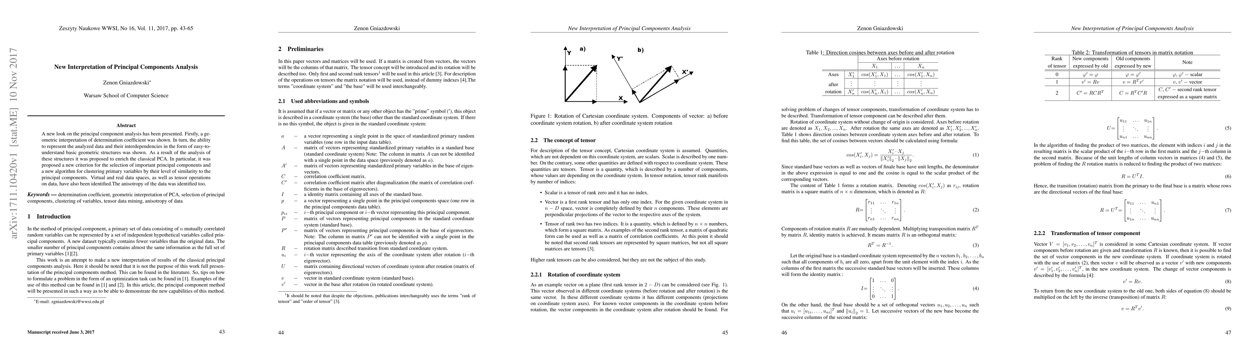 A new look on the principal component analysis has been presented. Firstly, a geometric interpretation of determination coefficient was shown. In turn, the ability to represent the analyzed data and their interdependencies in the form of easy-to-understand basic geometric structures was shown. As a result of the analysis of these structures it was proposed to enrich the classical PCA. In particular, it was proposed a new criterion for the selection of important principal components and a new algorithm for clustering primary variables by their level of similarity to the principal components. Virtual and real data spaces, as well as tensor operations on data, have also been identified.The anisotropy of the data was identified too.