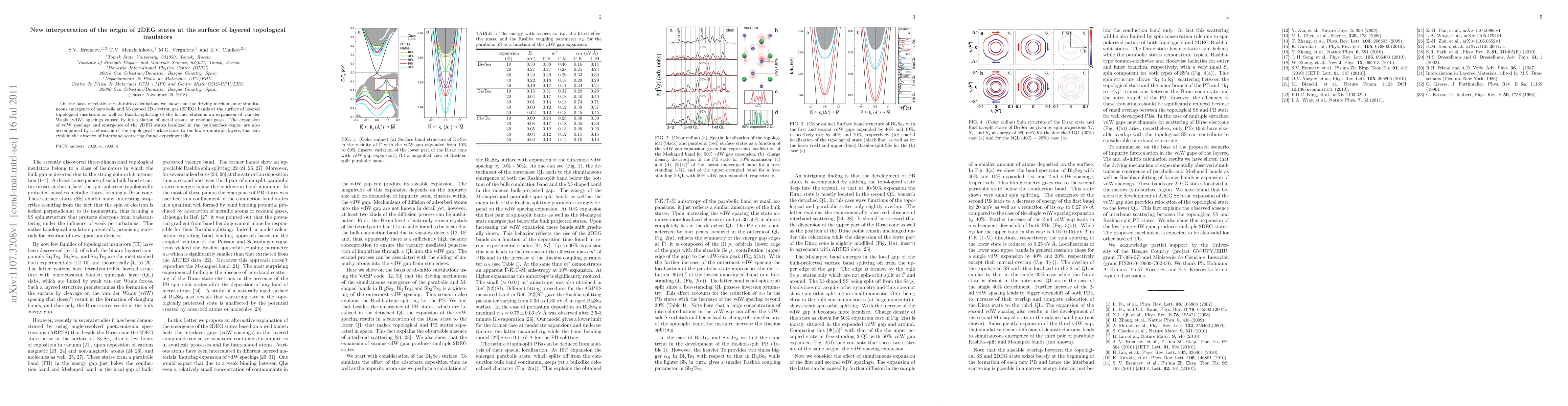 On the basis of relativistic ab-initio calculations we show that the driving mechanism of simultaneous emergence of parabolic and M-shaped 2D electron gas (2DEG) bands at the surface of layered topological insulators as well as Rashba-splitting of the former states is an expansion of van der Waals (vdW) spacings caused by intercalation of metal atoms or residual gases. The expansion of vdW spacings and emergence of the 2DEG states localized in the (sub)surface region are also accompanied by a relocation of the topological surface state to the lower quintuple layers, that can explain the absence of interband scattering found experimentally.