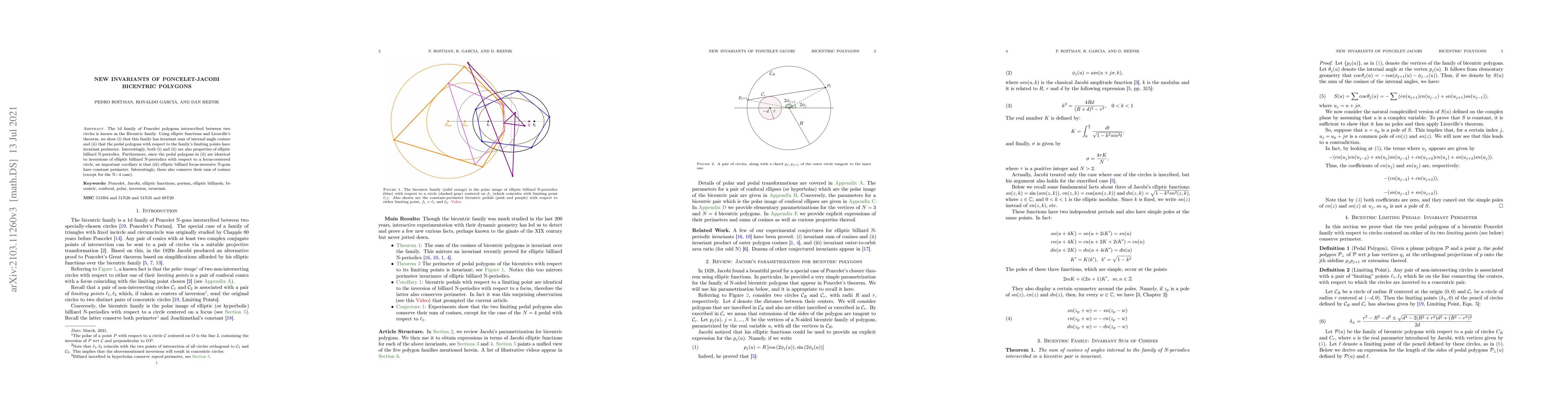 The 1d family of Poncelet polygons interscribed between two circles is known as the Bicentric family. Using elliptic functions and Liouville's theorem, we show (i) that this family has invariant sum of internal angle cosines and (ii) that the pedal polygons with respect to the family's limiting points have invariant perimeter. Interestingly, both (i) and (ii) are also properties of elliptic billiard N-periodics. Furthermore, since the pedal polygons in (ii) are identical to inversions of elliptic billiard N-periodics with respect to a focus-centered circle, an important corollary is that (iii) elliptic billiard focus-inversive N-gons have constant perimeter. Interestingly, these also conserve their sum of cosines (except for the N=4 case).