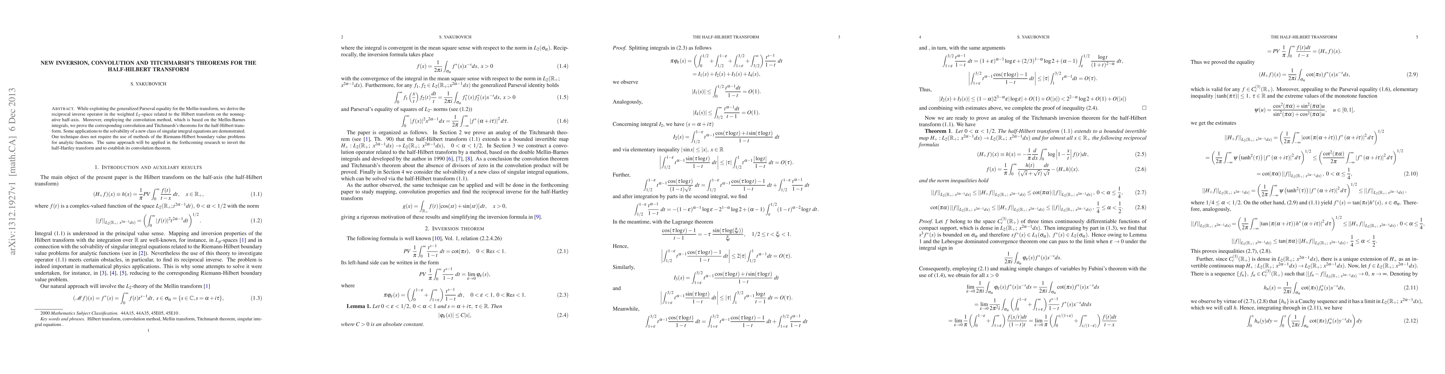 While exploiting the generalized Parseval equality for the Mellin transform, we derive the reciprocal inverse operator in the weighted L_2-space related to the Hilbert transform on the nonnegative half-axis. Moreover, employing the convolution method, which is based on the Mellin-Barnes integrals, we prove the corresponding convolution and Titchmarsh's theorems for the half-Hilbert transform. Some applications to the solvability of a new class of singular integral equations are demonstrated. Our technique does not require the use of methods of the Riemann-Hilbert boundary value problems for analytic functions. The same approach will be applied in the forthcoming research to invert the half-Hartley transform and to establish its convolution theorem.