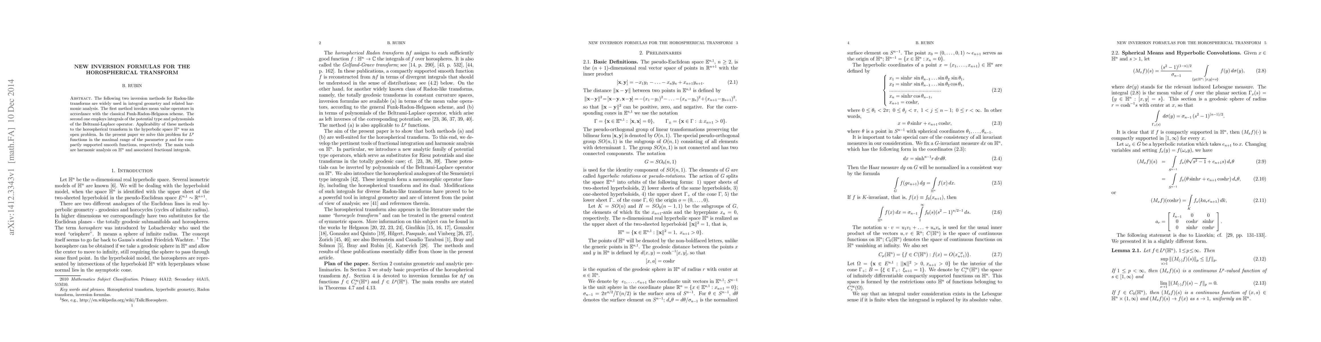 The following two inversion methods for Radon-like transforms are widely used in integral geometry and related harmonic analysis. The first method invokes mean value operators in accordance with the classical Funk-Radon-Helgason scheme. The second one employs integrals of the potential type and polynomials of the Beltrami-Laplace operator. Applicability of these methods to the horospherical transform in the hyperbolic space was an open problem. In the present paper we solve this problem for $L^p$ functions in the maximal range of the parameter $p$ and for compactly supported smooth functions, respectively. The main tools are harmonic analysis in the hyperbolic space and associated fractional integrals.