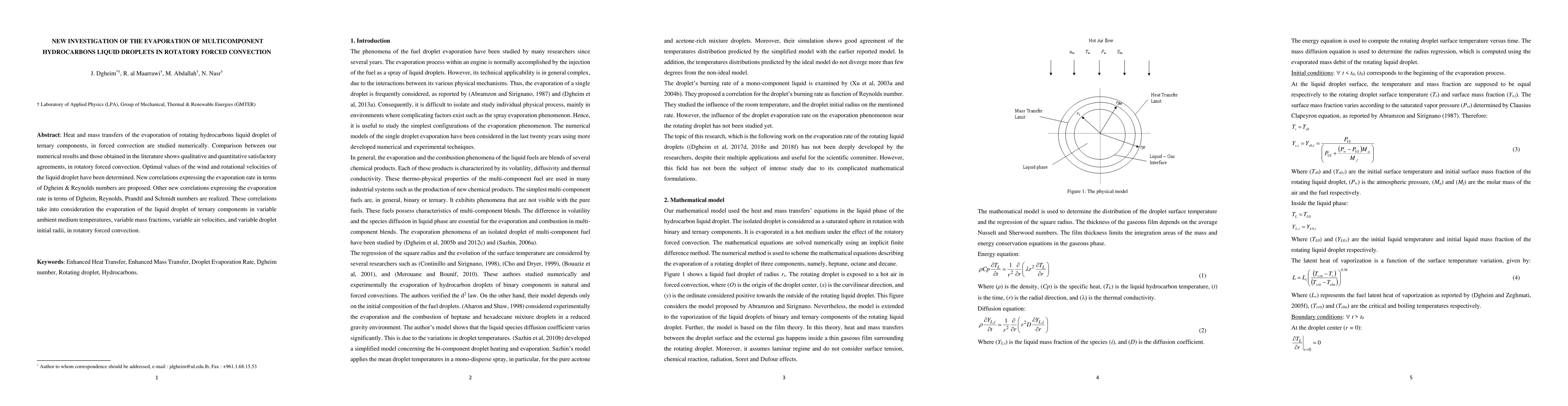 Heat and mass transfers of the evaporation of rotating hydrocarbons liquid droplet of ternary components, in forced convection are studied numerically. Comparison between our numerical results and those obtained in the literature shows qualitative and quantitative satisfactory agreements, in rotatory forced convection. Optimal values of the wind and rotational velocities of the liquid droplet have been determined. New correlations expressing the evaporation rate in terms of Dgheim & Reynolds numbers are proposed. Other new correlations expressing the evaporation rate in terms of Dgheim, Reynolds, Prandtl and Schmidt numbers are realized. These correlations take into consideration the evaporation of the liquid droplet of ternary components in variable ambient medium temperatures, variable mass fractions, variable air velocities, and variable droplet initial radii, in rotatory forced convection.