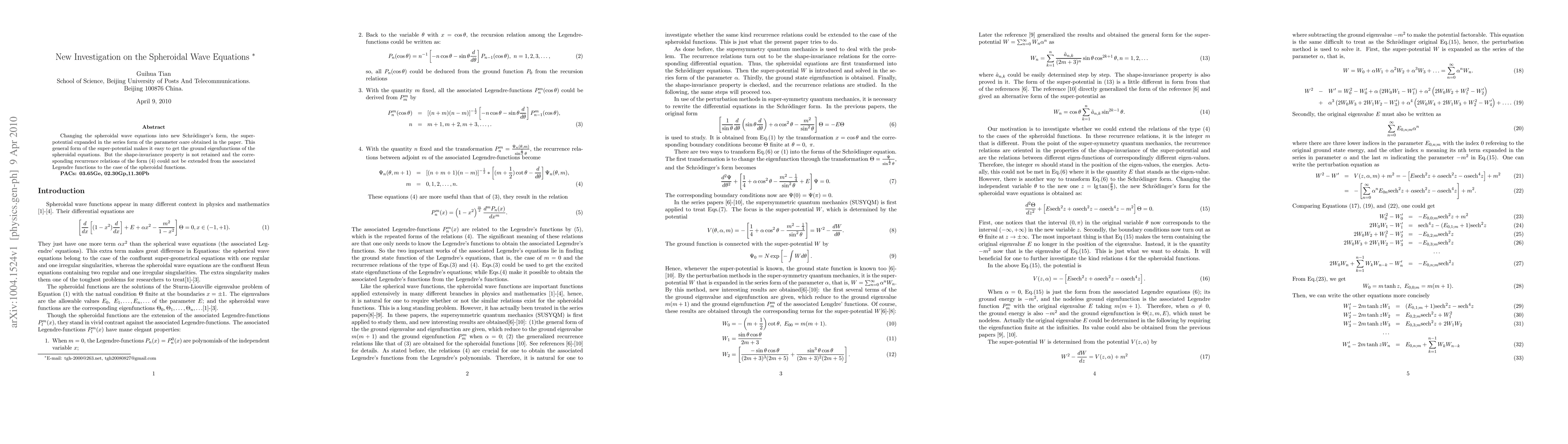 Changing the spheroidal wave equations into new Schro$dinger's form, the super-potential expanded in the series form of the parameter $\alpha$are obtained in the paper. This general form of the super-potential makes it easy to get the ground eigenfunctions of the spheroidal equations. But the shape-invariance property is not retained and the corresponding recurrence relations of the form (4) could not be extended from the associated Legendre functions to the case of the spheroidal functions.