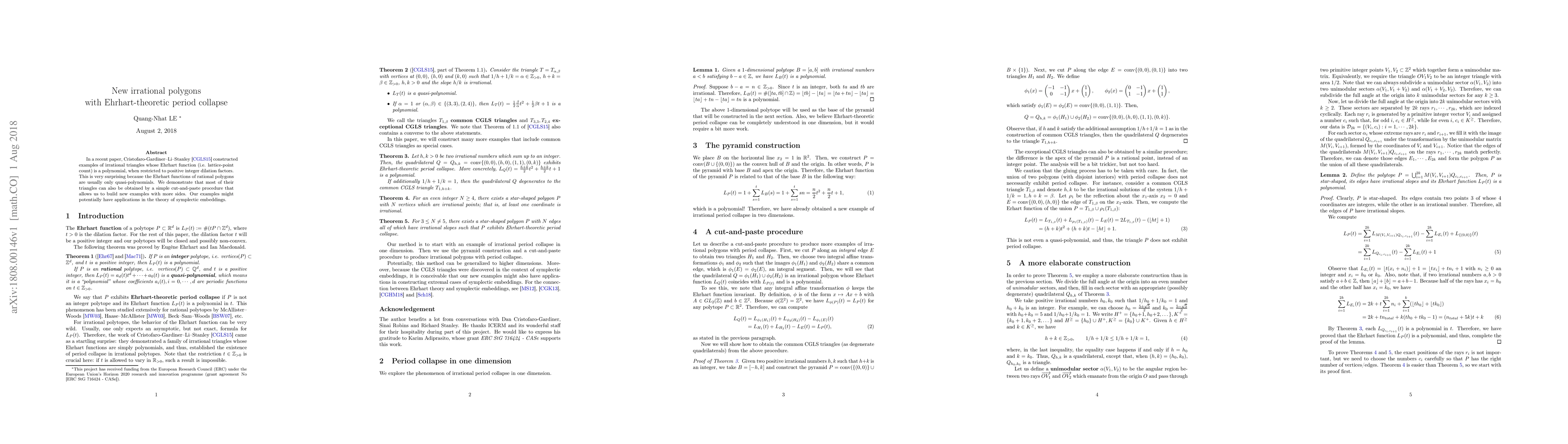 The paper demonstrates new examples of irrational polygons with Ehrhart-theoretic period collapse using a cut-and-paste procedure, starting from an example of irrational period collapse in one dimension and extending it to two dimensions via pyramid construction.