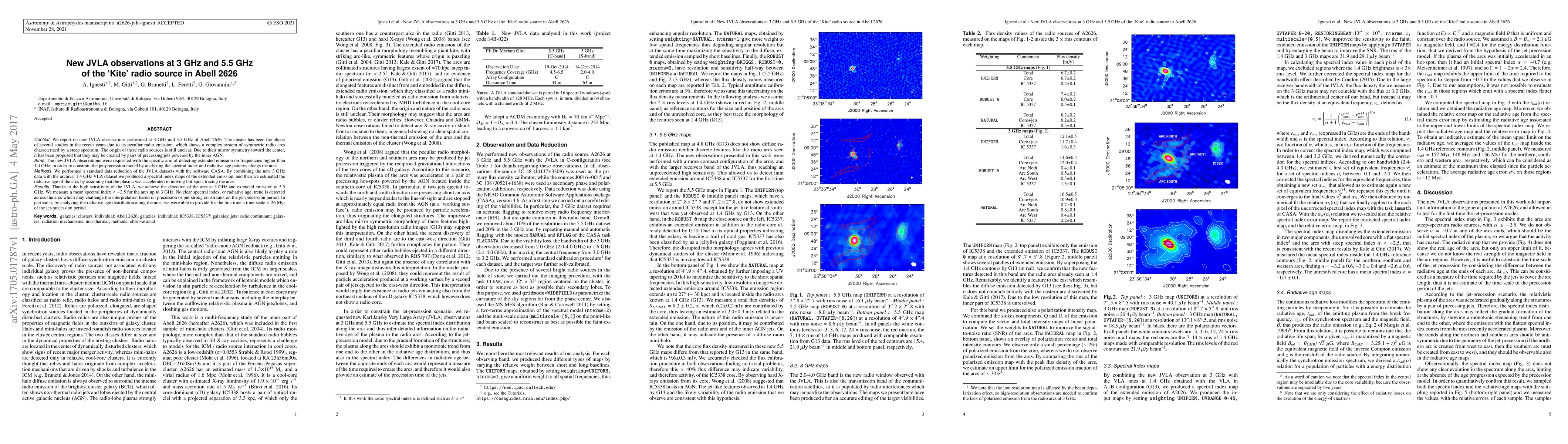 We report on new JVLA observations performed at 3 GHz and 5.5 GHz of Abell 2626. The cluster has been the object of several studies in the recent years due to its peculiar radio emission, which shows a complex system of symmetric radio arcs characterized by a steep spectrum. The origin of these radio sources is still unclear. Due to their mirror symmetry toward the center, it has been proposed that they may be created by pairs of precessing jets powered by the inner AGN. The new JVLA observations were requested with the specific aim of detecting extended emission on frequencies higher than 1.4 GHz, in order to constrain the jet-precession model by analyzing the spectral index and radiative age patterns alongs the arcs. We performed a standard data reduction of the JVLA datasets with the software CASA. By combining the new 3 GHz data with the archival 1.4 GHz VLA dataset we produced a spectral index maps of the extended emission, and then we estimated the radiative age of the arcs by assuming that the plasma was accelerated in moving hot-spots tracing the arcs. Thanks to the high sensitivity of the JVLA, we achieve the detection of the arcs at 3 GHz and extended emission at 5.5 GHz. We measure a mean spectral index <-2.5 for the arcs up to 3 GHz. No clear spectral index, or radiative age, trend is detected across the arcs which may challenge the interpretation based on precession or put strong constraints on the jet-precession period. In particular, by analyzing the radiative age distribution along the arcs, we were able to provide for the first time a time-scale < 26 Myr of the jet-precession period.
