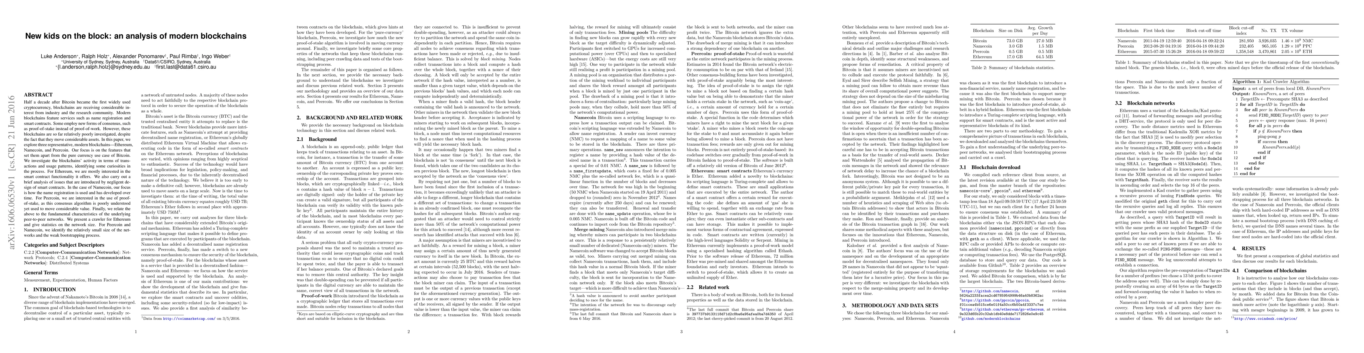 Half a decade after Bitcoin became the first widely used cryptocurrency, blockchains are receiving considerable interest from industry and the research community. Modern blockchains feature services such as name registration and smart contracts. Some employ new forms of consensus, such as proof-of-stake instead of proof-of-work. However, these blockchains are so far relatively poorly investigated, despite the fact that they move considerable assets. In this paper, we explore three representative, modern blockchains---Ethereum, Namecoin, and Peercoin. Our focus is on the features that set them apart from the pure currency use case of Bitcoin. We investigate the blockchains' activity in terms of transactions and usage patterns, identifying some curiosities in the process. For Ethereum, we are mostly interested in the smart contract functionality it offers. We also carry out a brief analysis of issues that are introduced by negligent design of smart contracts. In the case of Namecoin, our focus is how the name registration is used and has developed over time. For Peercoin, we are interested in the use of proof-of-stake, as this consensus algorithm is poorly understood yet used to move considerable value. Finally, we relate the above to the fundamental characteristics of the underlying peer-to-peer networks. We present a crawler for Ethereum and give statistics on the network size. For Peercoin and Namecoin, we identify the relatively small size of the networks and the weak bootstrapping process.