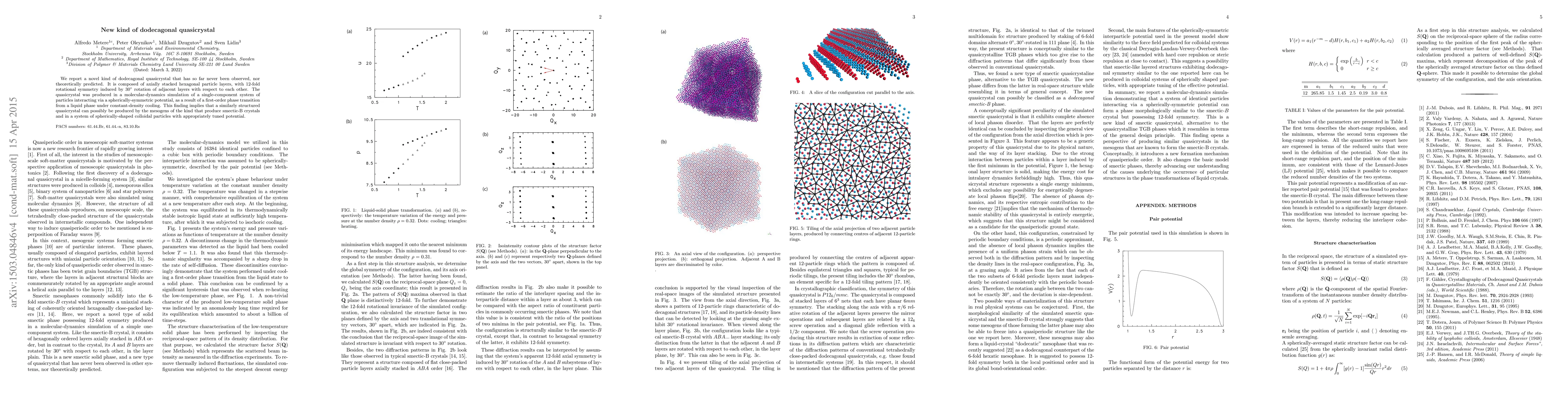 This study presents a new dodecagonal quasicrystal, composed of stacked hexagonal layers with 12-fold rotational symmetry, discovered via molecular-dynamics simulations during a phase transition from liquid. The potential for similar quasicrystals in other systems, like smectic-B crystals and colloidal particles, is suggested.