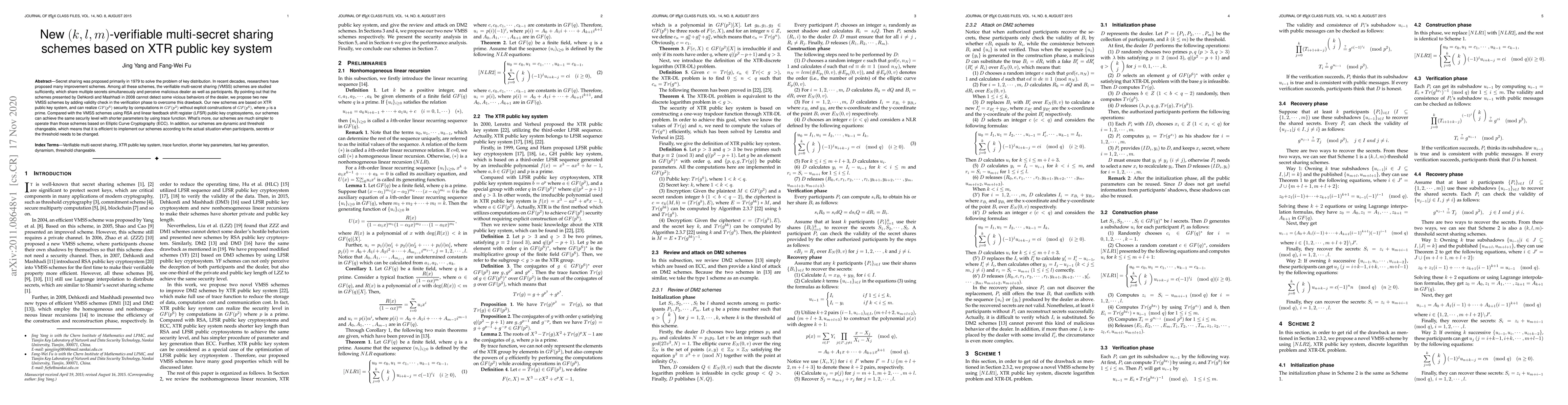 This paper proposes two new (k,l,m)-verifiable multi-secret sharing schemes based on the XTR public key system to address the limitations of previous schemes by Dehkordi and Mashhadi. The new schemes achieve $GF(p^{6})$ security through computations in $GF(p^{2})$, offering shorter parameters and simpler operations compared to RSA, LFSR, and ECC-based schemes.