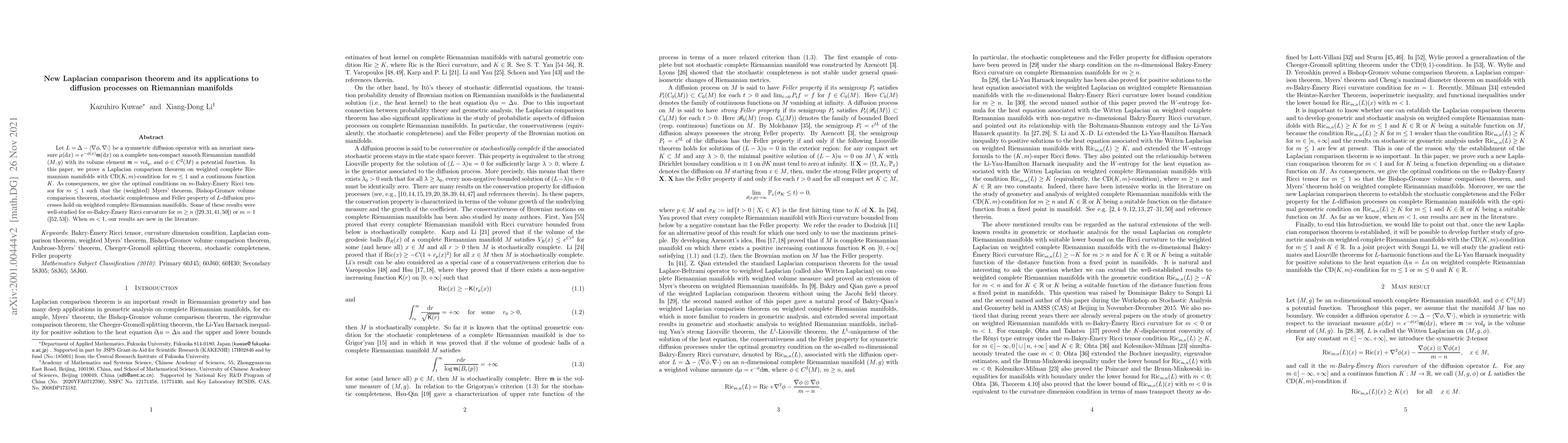 Let $L=\Delta-\nabla\phi\cdot \nabla$ be a symmetric diffusion operator with an invariant measure $\mu({\rm} d x)=e^{-\phi(x)}{\mathfrak m}({\rm d} x)$ on a complete non-compact smooth Riemannian manifold $(M,g)$ with its volume element ${\mathfrak m}={\rm vol}_g$, and $\phi\in C^2(M)$ a potential function. In this paper, we prove a Laplacian comparison theorem on weighted complete Riemannian manifolds with ${\rm CD}(K, m)$-condition for $m\leq 1$ and a continuous function $K$. As consequences, we give the optimal conditions on $m$-Bakry-\'Emery Ricci tensor for $m\leq1$ such that the (weighted) Myers' theorem, Bishop-Gromov volume comparison theorem, Ambrose-Myers' theorem, and the Cheeger-Gromoll type splitting theorem, stochastic completeness and Feller property of $L$-diffusion processes hold on weighted complete Riemannian manifolds. Some of these results were well-studied for $m$-Bakry-\'Emery Ricci curvature for $m\geq n$ (\!\!\cite{Lot,Qian,XDLi05, WeiWylie}) or $m=1$ (\!\!\cite{Wylie:WarpedSplitting, WylieYeroshkin}). When $m<1$, our results are new in the literature.