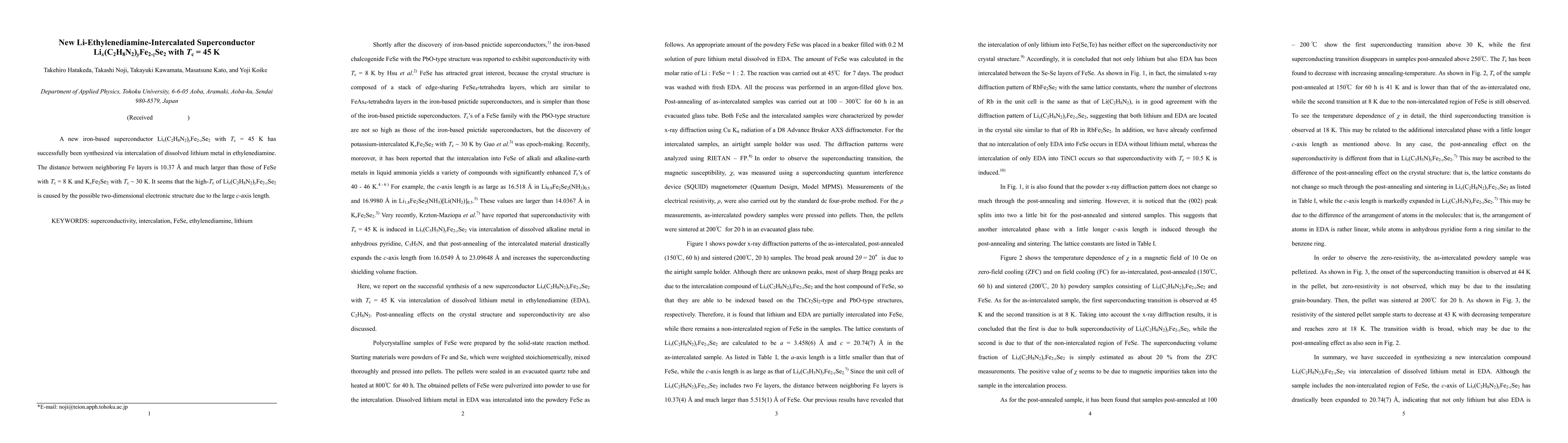 A new iron-based superconductor, Li$_x$(C$_2$H$_8$N$_2$)$_y$Fe$_{2-z}$Se$_2$, with a critical temperature ($T_c$) of 45 K, was synthesized through lithium intercalation in ethylenediamine, exhibiting a large $c$-axis length that suggests a two-dimensional electronic structure enhancing superconductivity.