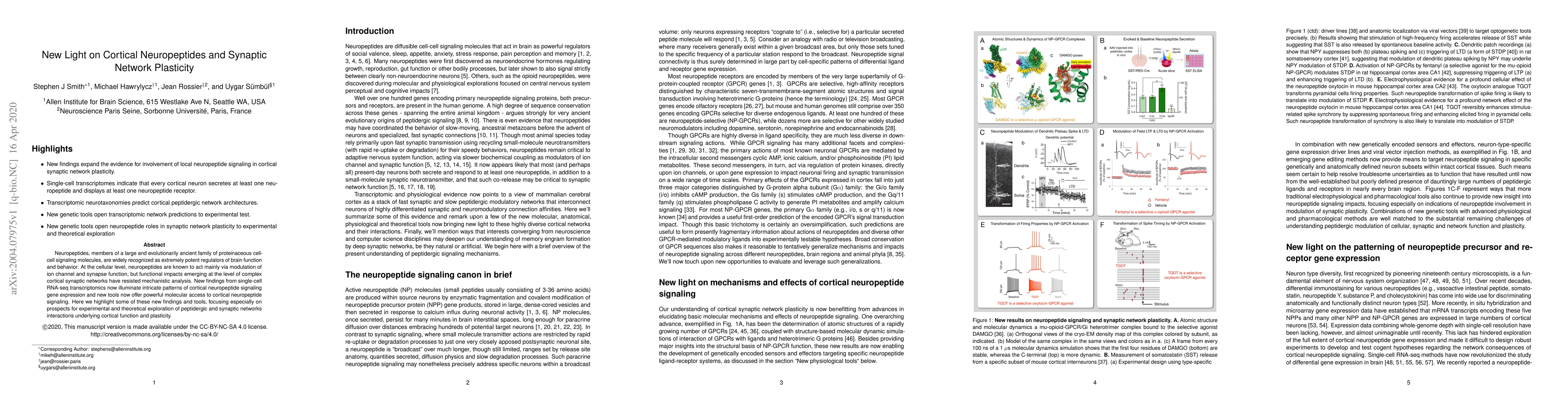 This paper explores recent advances in understanding the role of neuropeptides in modulating cortical synaptic network plasticity, utilizing single-cell RNA-seq to reveal detailed patterns of neuropeptide signaling gene expression and introducing new molecular tools for studying these interactions. The findings open new avenues for both experimental and theoretical investigations into how neuropeptides influence cortical function and plasticity.