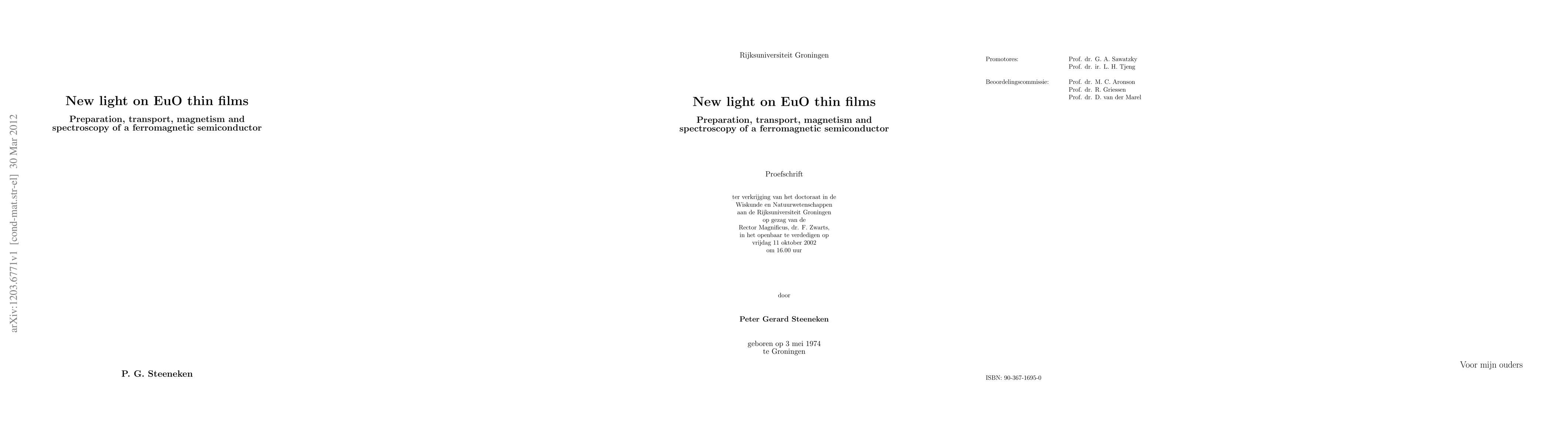 This PhD thesis investigates the properties of the ferromagnetic semiconductor EuO, focusing on its magneto-optical spectrum, epitaxial growth via MBE, spin-resolved band-structure, and temperature-dependent spectroscopy. It also delves into magnetotransport and phototransport measurements, supervised by G.A. Sawatzky and L.H. Tjeng.