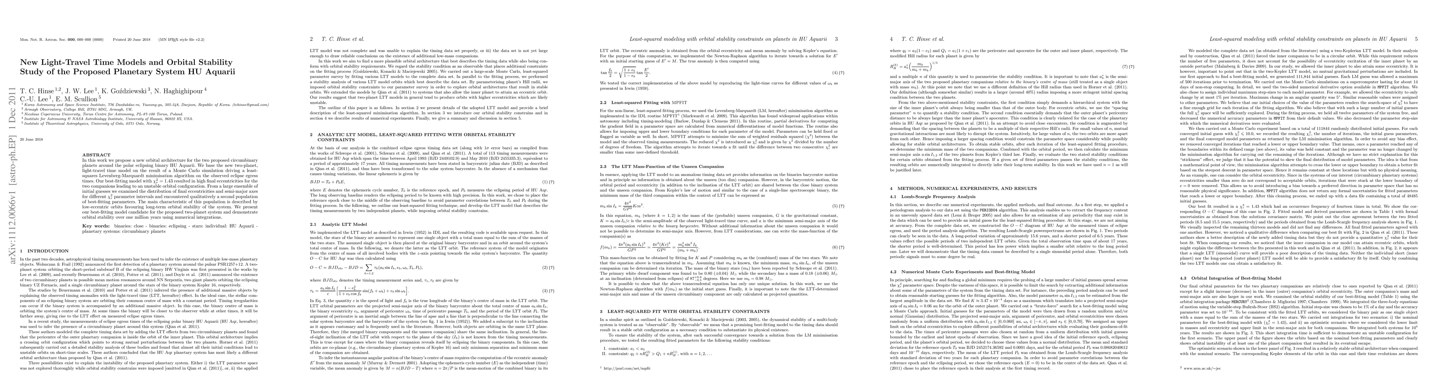 In this work we propose a new orbital architecture for the two proposed circumbinary planets around the polar eclipsing binary HU Aquarii. We base the new two-planet, light-travel time model on the result of a Monte Carlo simulation driving a least-squares Levenberg-Marquardt minimisation algorithm on the observed eclipse egress times. Our best-fitting model with $\chi_{r}^2=1.43$ resulted in high final eccentricities for the two companions leading to an unstable orbital configuration. From a large ensemble of initial guesses we examined the distribution of final eccentricities and semi-major axes for different $\chi_{r}^2$ parameter intervals and encountered qualitatively a second population of best-fitting parameters. The main characteristic of this population is described by low-eccentric orbits favouring long-term orbital stability of the system. We present our best-fitting model candidate for the proposed two-planet system and demonstrate orbital stability over one million years using numerical integrations.