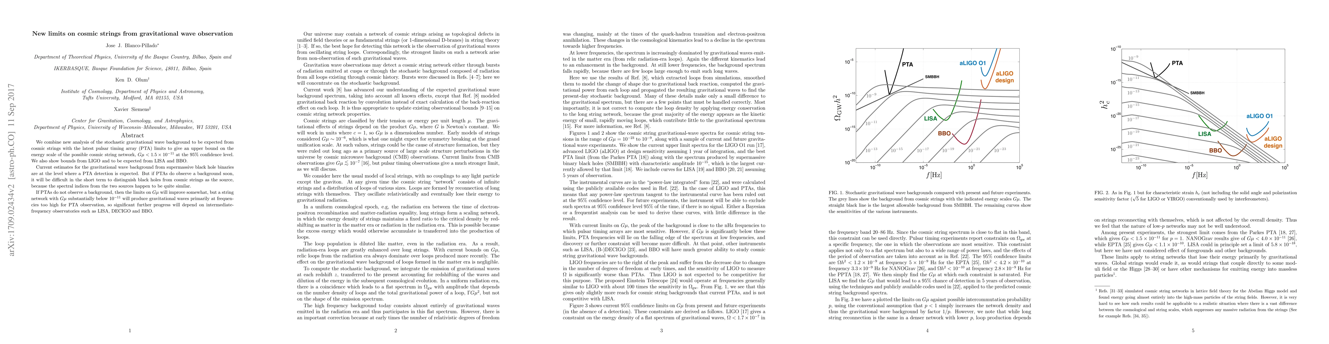 This paper sets new limits on cosmic strings by analyzing the gravitational wave background, combining pulsar timing array data with LIGO and future LISA/BBO observations, resulting in an upper bound of $G\mu < 1.5\times 10^{-11}$ at 95% confidence. It discusses the challenges in distinguishing cosmic strings from supermassive black hole binaries in gravitational wave detections.