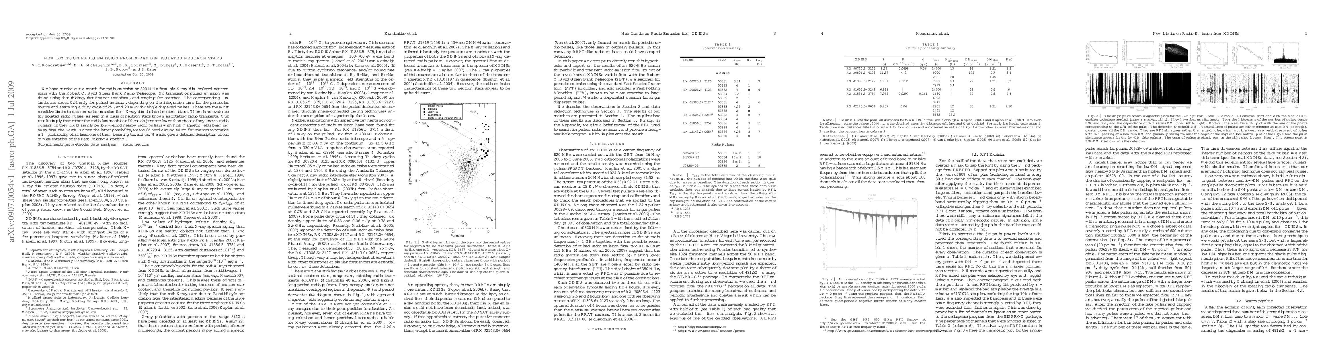 We have carried out a search for radio emission at 820 MHz from six X-ray dim isolated neutron stars with the Robert C. Byrd Green Bank Radio Telescope. No transient or pulsed emission was found using fast folding, fast Fourier transform, and single-pulse searches. The corresponding flux limits are about 0.01 mJy for pulsed emission, depending on the integration time for the particular source and assuming a duty cycle of 2%, and 20 mJy for single dispersed pulses. These are the most sensitive limits to date on radio emission from X-ray dim isolated neutron stars. There is no evidence for isolated radio pulses, as seen in a class of neutron stars known as rotating radio transients. Our results imply that either the radio luminosities of these objects are lower than those of any known radio pulsars, or they could simply be long-period nearby radio pulsars with high magnetic fields beaming away from the Earth. To test the latter possibility, we would need around 40 similar sources to provide a 1 sigma probability of at least one of them beaming toward us. We also give a detailed description of our implementation of the Fast Folding Algorithm.