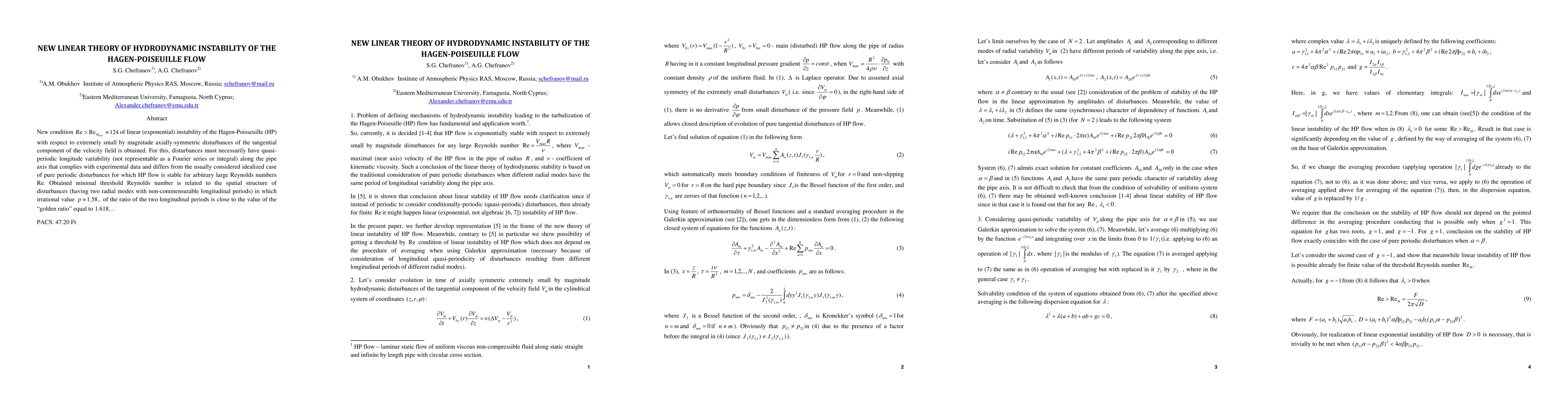 New condition Re>Re_th_min=124 of linear (exponential) instability of the Hagen-Poisseuille (HP) with respect to extremely small by magnitude axially-symmetric disturbances of the tangential component of the velocity field is obtained. For this, disturbances must necessarily have quasi-periodic longitude variability (not representable as a Fourier series or integral) along the pipe axis that complies with experimental data and differs from the usually considered idealized case of pure periodic disturbances for which HP flow is stable for arbitrary large Reynolds numbers Re. Obtained minimal threshold Reynolds number is related to the spatial structure of disturbances (having two radial modes with non-commensurable longitudinal periods) in which irrational value p=1.58 of the ratio of the two longitudinal periods is close to the value of the "golden ratio" equal to 1.618.