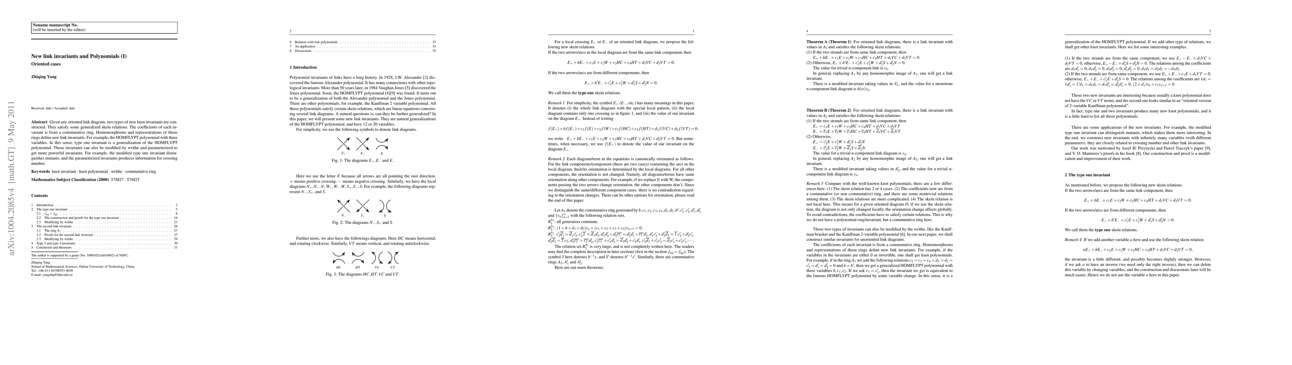Given any oriented link diagram, two types of new knot invariants are constructed. They satisfy some generalized skein relations. The coefficients of each invariant is from a commutative ring. Homomorphisms and representations of those rings define new link invariants. For example, the HOMFLYPT polynomial with three variables. In this sense, type one invariant is a generalization of the HOMFLYPT polynomial. Those invariants can also be modified by writhe and parameterized to get more powerful invariants. For example, the modified type one invariant distinguishes mutants, and the parameterized invariants produces information for crossing number.