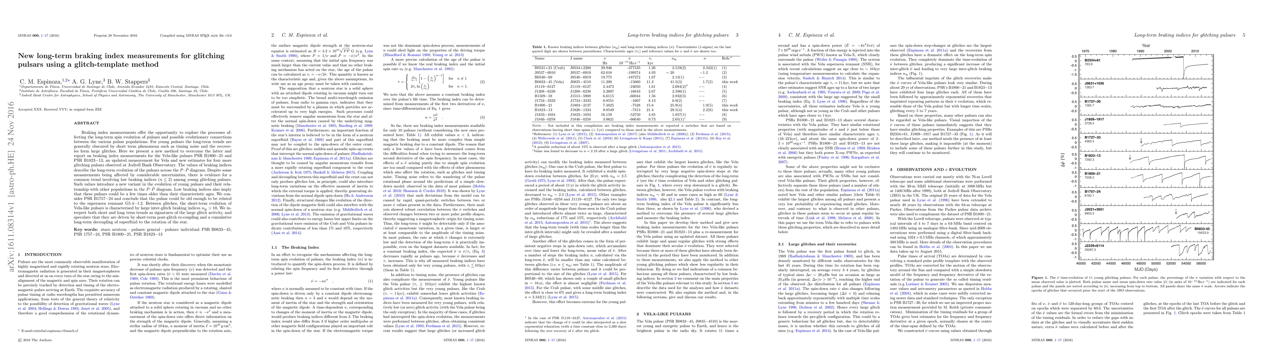 This paper introduces a glitch-template method to measure long-term braking indices for glitching pulsars, revealing low braking indices (n ≤ 2) among young pulsars, suggesting they may be older than their characteristic ages and hinting at evolutionary connections between pulsar populations.