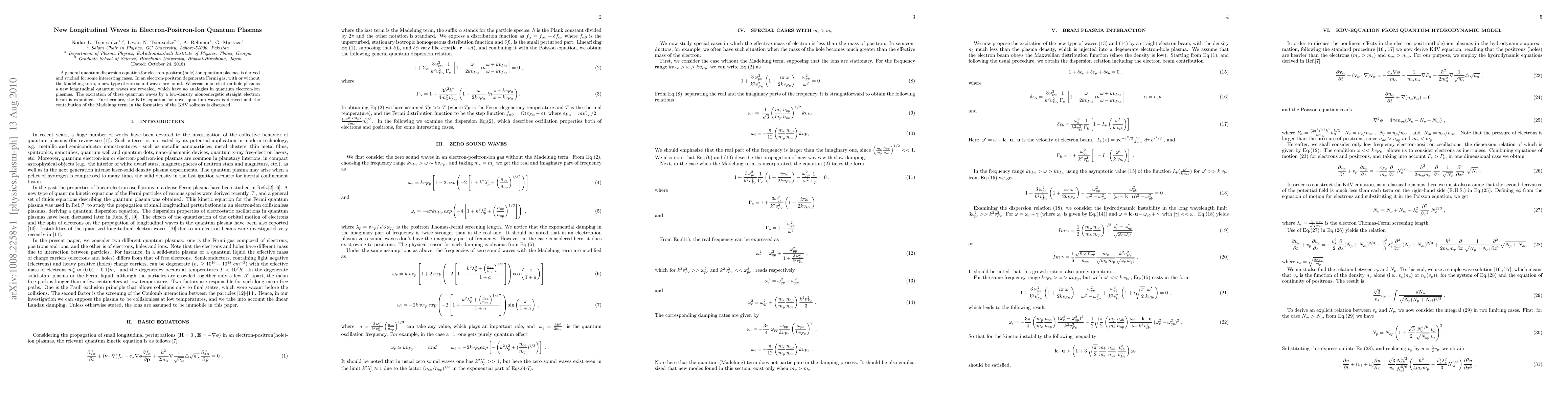 This paper derives a quantum dispersion equation for electron-positron-ion plasmas and identifies new longitudinal quantum waves in electron-hole plasmas, distinct from those in quantum electron-ion plasmas. The study also examines the excitation of these waves by a low-density electron beam and derives the KdV equation for these novel quantum waves, discussing the Madelung term's role in KdV soliton formation.