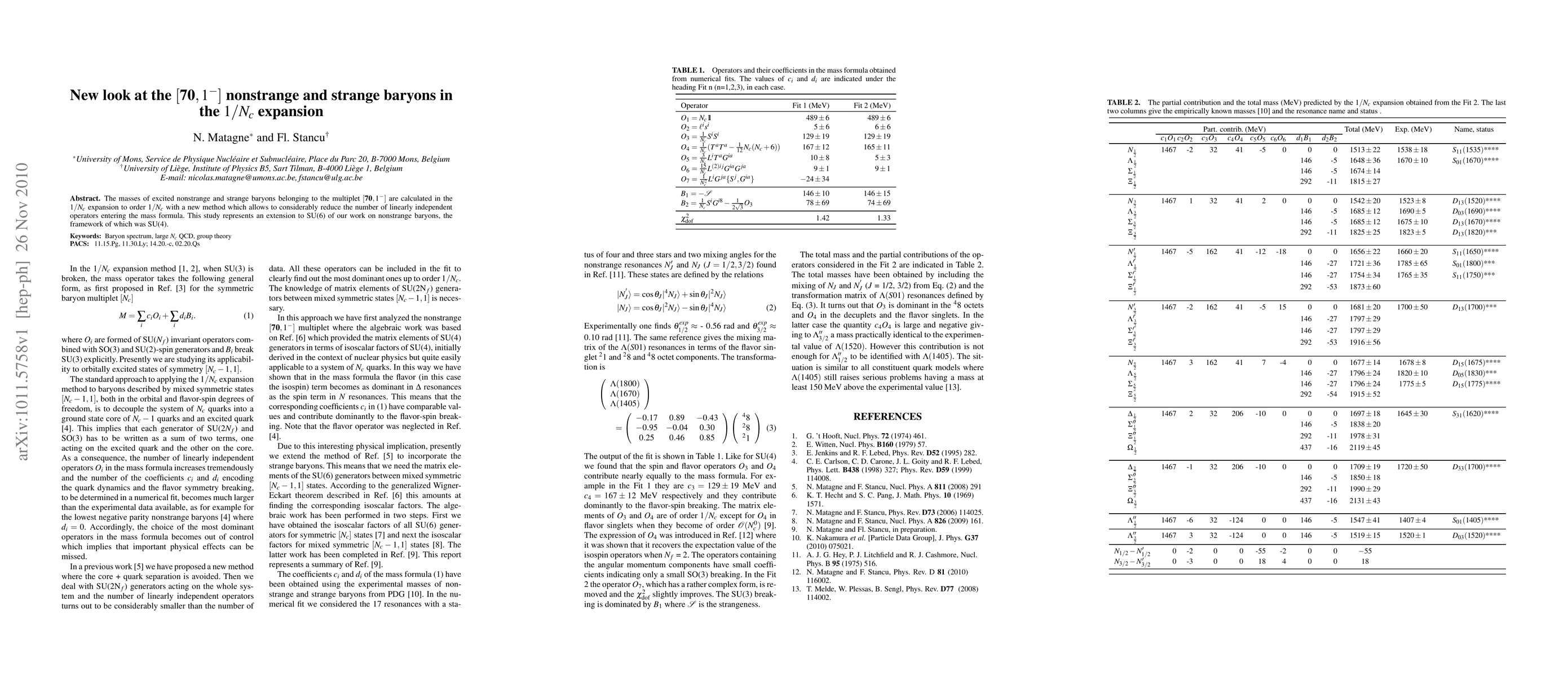 The masses of excited nonstrange and strange baryons belonging to the multiplet $[{\bf 70},1^-]$ are calculated in the $1/N_c$ expansion to order $1/N_c$ with a new method which allows to considerably reduce the number of linearly independent operators entering the mass formula. This study represents an extension to SU(6) of our work on nonstrange baryons, the framework of which was SU(4).
