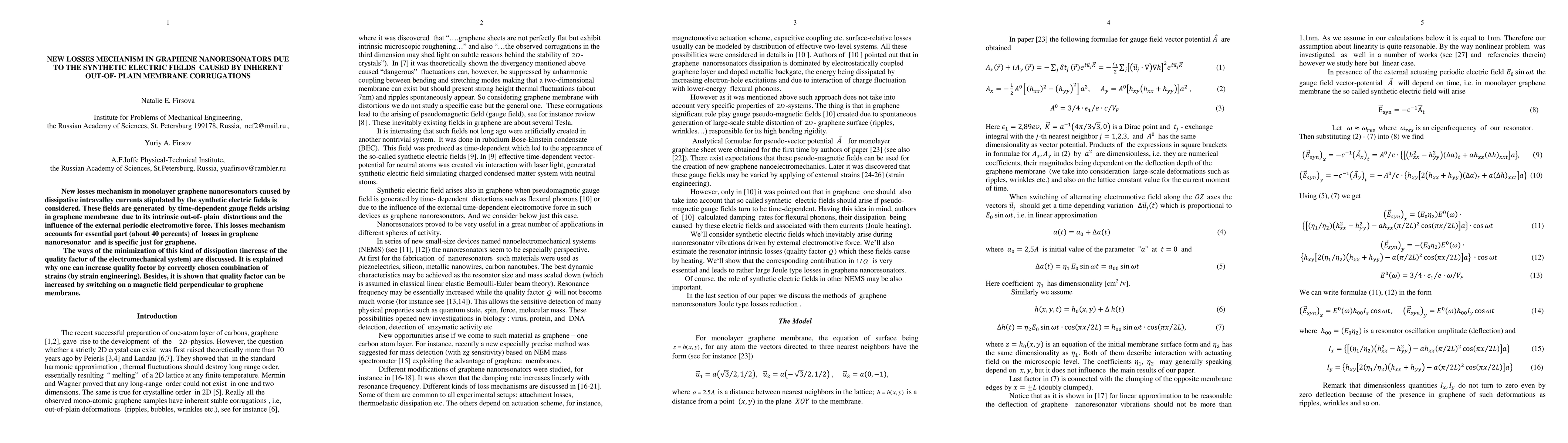 New losses mechanism in monolayer graphene nanoresonators caused by dissipative intravalley currents stipulated by the synthetic electric fields is considered. These fields are generated by time-dependent gauge fields arising in graphene membrane due to its intrinsic out-of- plain distortions and the influence of the external periodic electromotive force. This losses mechanism accounts for essential part (about 40 percents) of losses in graphene nanoresonator and is specific just for graphene. The ways of the minimization of this kind of dissipation (increase of the quality factor of the electromechanical system) are discussed. It is explained why one can increase quality factor by correctly chosen combination of strains (by strain engineering). Besides, it is shown that quality factor can be increased by switching on a magnetic field perpendicular to graphene membrane.