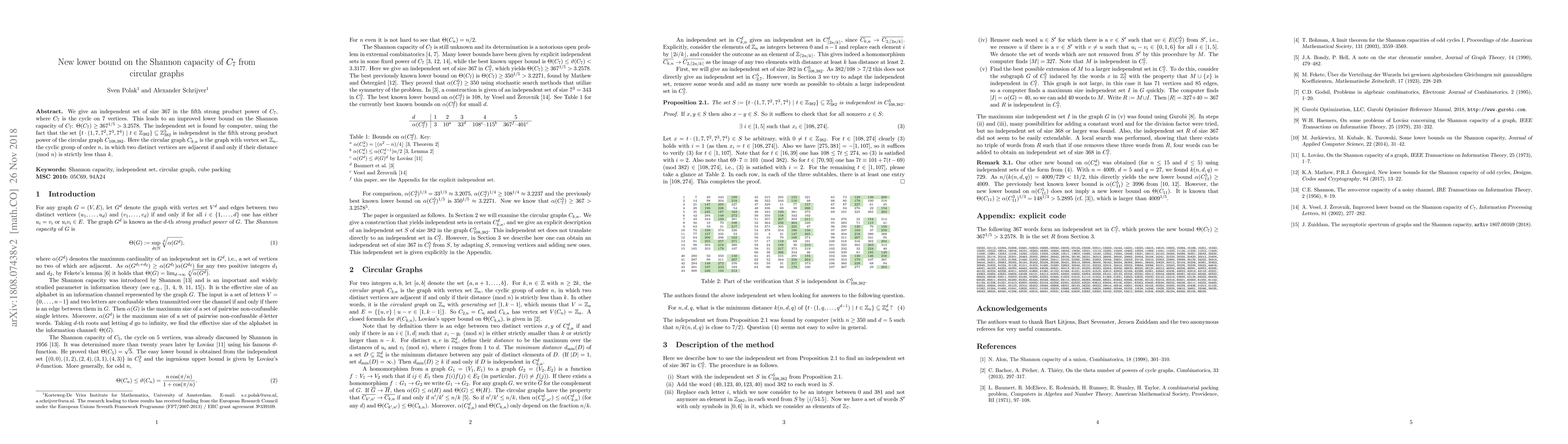 The paper presents a method to find an independent set of size 367 in the fifth strong product power of C7 using circular graphs and stochastic search methods, leading to an improved lower bound on the Shannon capacity of C7.