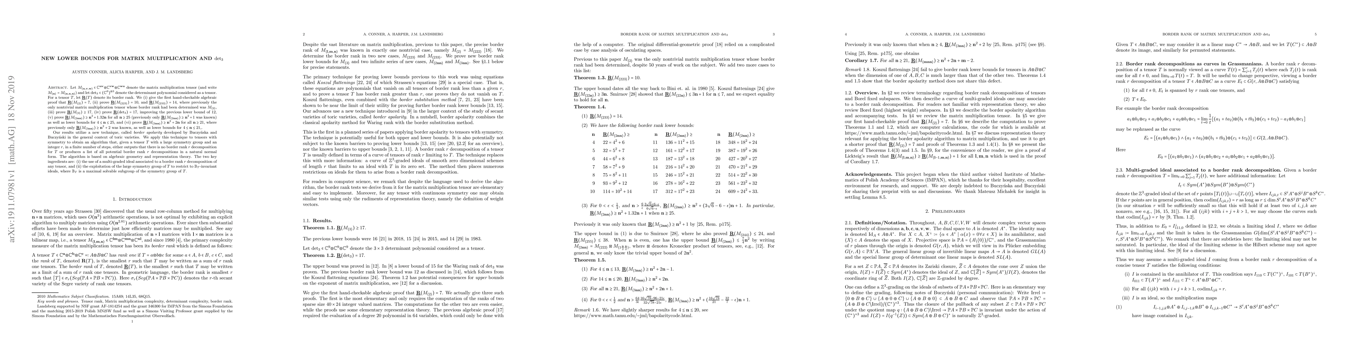 Let $M_{\langle u,v,w\rangle}\in C^{uv}\otimes C^{vw}\otimes C^{wu}$ denote the matrix multiplication tensor (and write $M_n=M_{\langle n,n,n\rangle}$) and let $det_3\in ( C^9)^{\otimes 3}$ denote the determinant polynomial considered as a tensor. For a tensor $T$, let $\underline R(T)$ denote its border rank. We (i) give the first hand-checkable algebraic proof that $\underline R(M_2)=7$,(ii) prove $\underline R(M_{\langle 223\rangle})=10$, and $\underline R(M_{\langle 233\rangle})=14$, where previously the only nontrivial matrix multiplication tensor whose border rank had been determined was $M_2$,(iii) prove $\underline R( M_3)\geq 17$, (iv) prove $\underline R( det_3)=17$, improving the previous lower bound of $12$, (v) prove $\underline R(M_{\langle 2nn\rangle})\geq n^2+1.32n$ for all $n\geq 25$ (previously only $\underline R(M_{\langle 2nn\rangle})\geq n^2+1$ was known) as well as lower bounds for $4\leq n\leq 25$, and (vi) prove $\underline R(M_{\langle 3nn\rangle})\geq n^2+2 n+1$ for all $ n\geq 21$, where previously only $\underline R(M_{\langle 3nn\rangle})\geq n^2+2$ was known, as well as lower boundsfor $4\leq n\leq 21$. Our results utilize a new technique initiated by Buczy\'{n}ska and Buczy\'{n}ski, called border apolarity. The two key ingredients are: (i) the use of a multi-graded ideal associated to a border rank $r$ decomposition of any tensor, and (ii) the exploitation of the large symmetry group of $T$ to restrict to $B_T$-invariant ideals, where $B_T$ is a maximal solvable subgroup of the symmetry group of $T$.