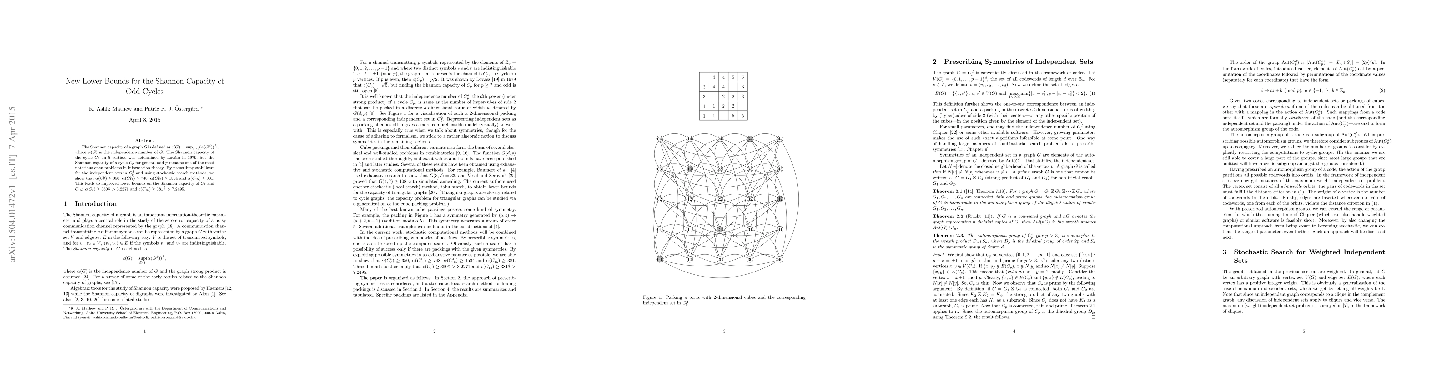 The Shannon capacity of a graph $G$ is defined as $c(G)=\sup_{d\geq 1}(\alpha(G^d))^{\frac{1}{d}},$ where $\alpha(G)$ is the independence number of $G$. The Shannon capacity of the cycle $C_5$ on $5$ vertices was determined by Lov\'{a}sz in 1979, but the Shannon capacity of a cycle $C_p$ for general odd $p$ remains one of the most notorious open problems in information theory. By prescribing stabilizers for the independent sets in $C_p^d$ and using stochastic search methods, we show that $\alpha(C_7^5)\geq 350$, $\alpha(C_{11}^4)\geq 748$, $\alpha(C_{13}^4)\geq 1534$ and $\alpha(C_{15}^3)\geq 381$. This leads to improved lower bounds on the Shannon capacity of $C_7$ and $C_{15}$: $c(C_7)\geq 350^{\frac{1}{5}}> 3.2271$ and $c(C_{15})\geq 381^{\frac{1}{3}}> 7.2495$.