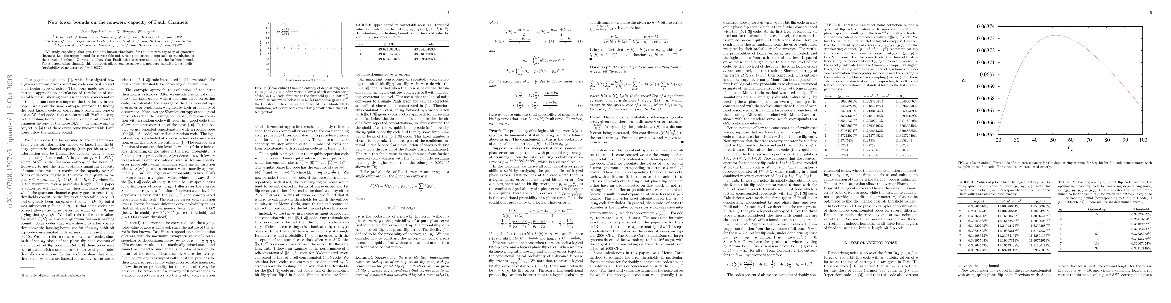 This paper establishes new lower bounds for the non-zero capacity of Pauli channels, demonstrating that Pauli noise is correctable up to the hashing bound. The study achieves a non-zero capacity for depolarizing channels at a fidelity of f=0.80870 using an entropic approach.