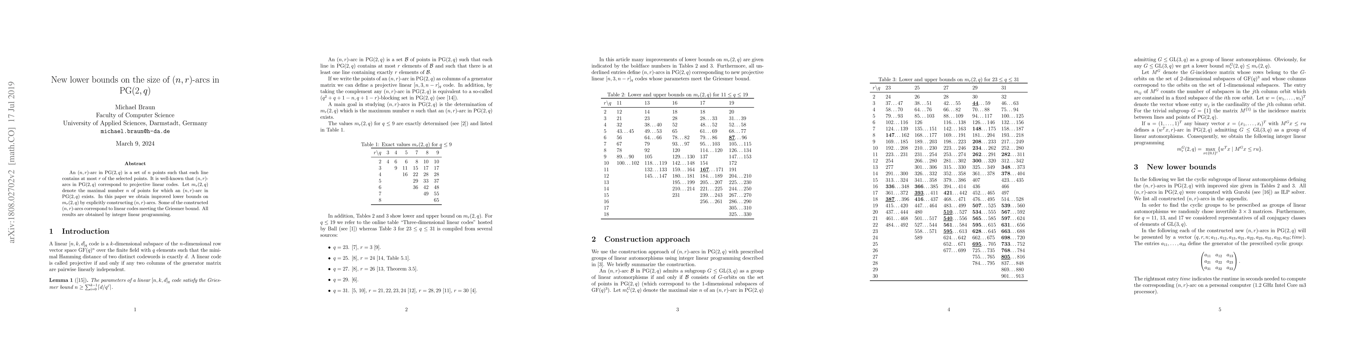 This paper presents new lower bounds for the size of (n,r)-arcs in PG(2,q) using integer linear programming, with some arcs corresponding to projective linear codes meeting the Griesmer bound. The constructions explicitly improve upon previous bounds for m_r(2,q).