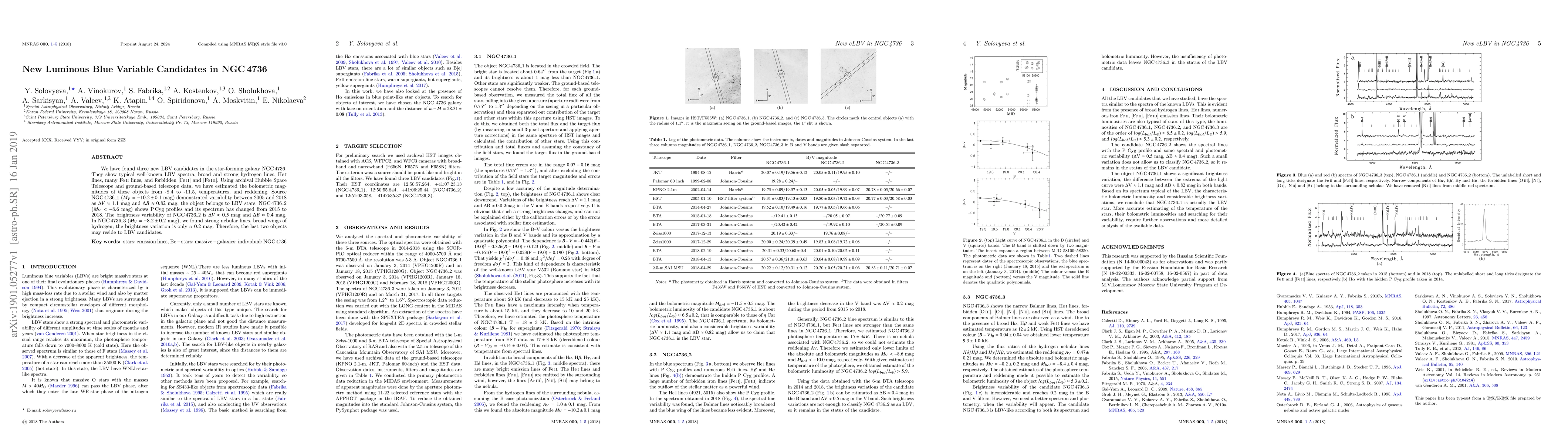 We have found three new LBV candidates in the star-forming galaxy NGC 4736. They show typical well-known LBV spectra, broad and strong hydrogen lines, He I lines, many Fe II lines, and forbidden [Fe II] and [Fe III]. Using archival Hubble Space Telescope and ground-based telescope data, we have estimated the bolometric magnitudes of these objects from -8.4 to -11.5, temperatures, and reddening. Source NGC 4736_1 (Mv = -10.2 +/- 0.1 mag) demonstrated variability between 2005 and 2018 as Delta V = 1.1 mag and Delta B = 0.82 mag, the object belongs to LBV stars. NGC 4736_2 (Mv < -8.6 mag) shows P Cyg profiles and its spectrum has changed from 2015 to 2018. The brightness variability of NGC 4736_2 is Delta V = 0.5 mag and Delta B = 0.4 mag. In NGC 4736_3 (Mv = -8.2 +/- 0.2 mag), we found strong nebular lines, broad wings of hydrogen; the brightness variation is only 0.2 mag. Therefore, the last two objects may reside to LBV candidates.