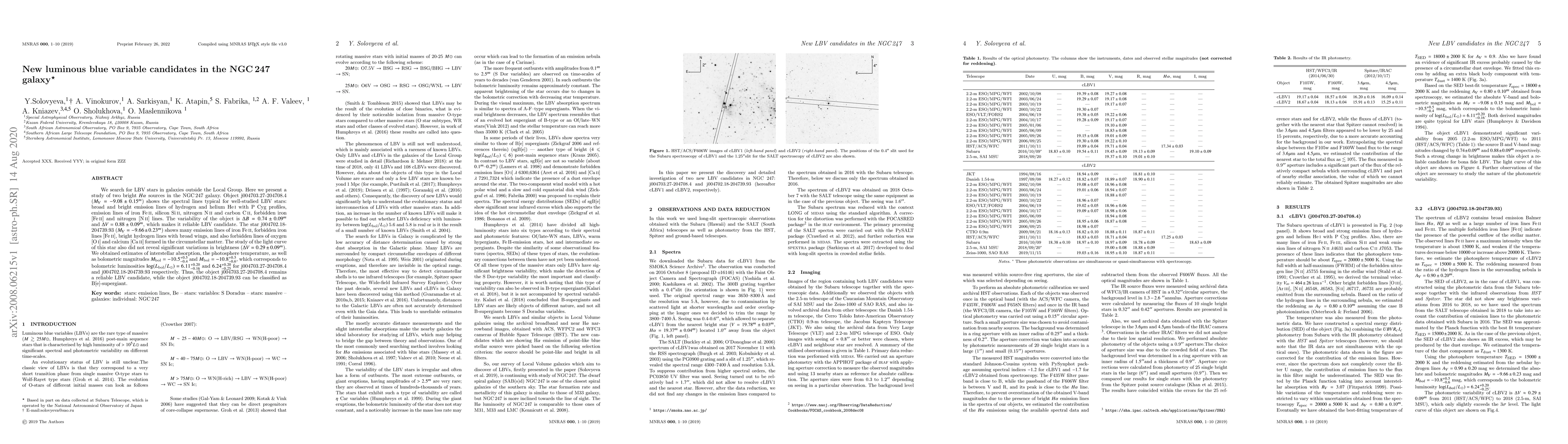 We search for LBV stars in galaxies outside the Local Group. Here we present a study of two bright $H\alpha$ sources in the NGC 247 galaxy. Object j004703.27-204708.4 ($M_V=-9.08 \pm 0.15^m$) shows the spectral lines typical for well-studied LBV stars: broad and bright emission lines of hydrogen and helium He I with P Cyg profiles, emission lines of iron Fe II, silicon Si II, nitrogen N II and carbon C II, forbidden iron [Fe II] and nitrogen [N II] lines. The variability of the object is $\Delta B = 0.74\pm0.09^m$ and $\Delta V = 0.88\pm0.09^m$, which makes it reliable LBV candidate. The star j004702.18-204739.93 ($M_V=-9.66 \pm 0.23^m$) shows many emission lines of iron Fe II, forbidden iron lines [Fe II], bright hydrogen lines with broad wings, and also forbidden lines of oxygen [O I] and calcium [Ca II] formed in the circumstellar matter. The study of the light curve of this star also did not reveal significant variations in brightness ($\Delta V = 0.29\pm0.09^m$). We obtained estimates of interstellar absorption, the photosphere temperature, as well as bolometric magnitudes $M_\text{bol}=-10.5^{+0.5}_{-0.4}$ and $M_\text{bol}=-10.8^{+0.5}_{-0.6}$, which corresponds to bolometric luminosities $\log(L_\text{bol}/L_{\odot})=6.11^{+0.20}_{-0.16}$ and $6.24^{+0.20}_{-0.25}$ for j004703.27-204708.4 and j004702.18-204739.93 respectively. Thus, the object j004703.27-204708.4 remains a reliable LBV candidate, while the object j004702.18-204739.93 can be classified as B[e]-supergiant.