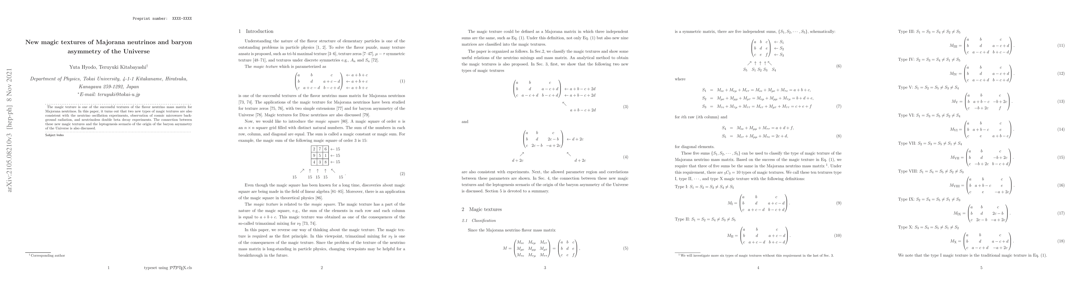 The magic texture is one of the successful textures of the flavor neutrino mass matrix for Majorana neutrinos. In this paper, it turns out that two new types of magic textures are also consistent with the neutrino oscillation experiments, observation of cosmic microwave background radiation, and neutrinoless double beta decay experiments. The connection between these new magic textures and the leptogenesis scenario of the origin of the baryon asymmetry of the Universe is also discussed.