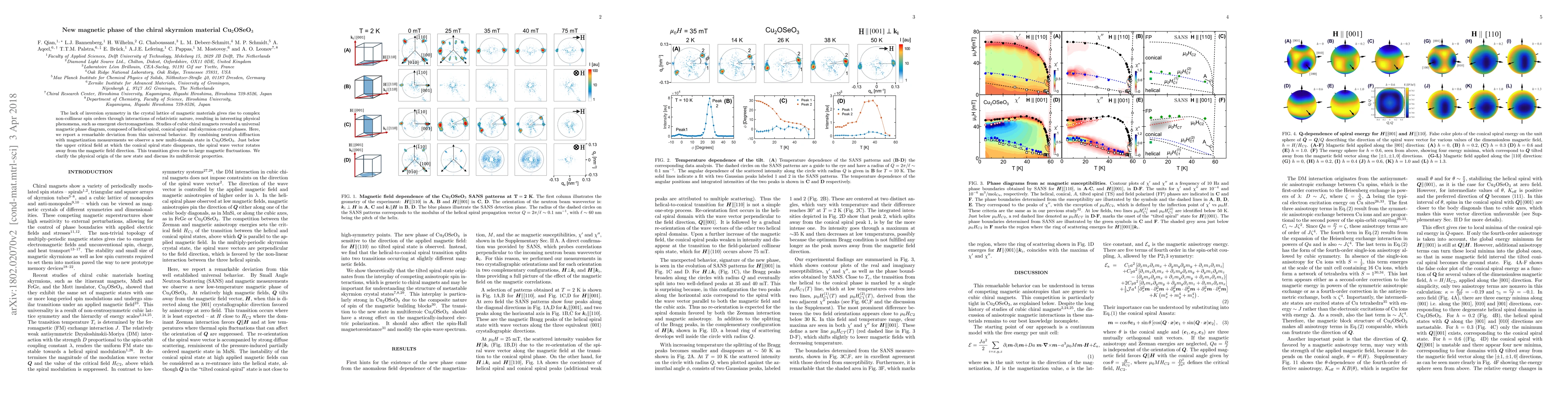The lack of inversion symmetry in the crystal lattice of magnetic materials gives rise to complex non-collinear spin orders through interactions of relativistic nature, resulting in interesting physical phenomena, such as emergent electromagnetism. Studies of cubic chiral magnets revealed a universal magnetic phase diagram, composed of helical spiral, conical spiral and skyrmion crystal phases. Here, we report a remarkable deviation from this universal behavior. By combining neutron diffraction with magnetization measurements we observe a new multi-domain state in Cu2OSeO3. Just below the upper critical field at which the conical spiral state disappears, the spiral wave vector rotates away from the magnetic field direction. This transition gives rise to large magnetic fluctuations. We clarify physical origin of the new state and discuss its multiferroic properties.