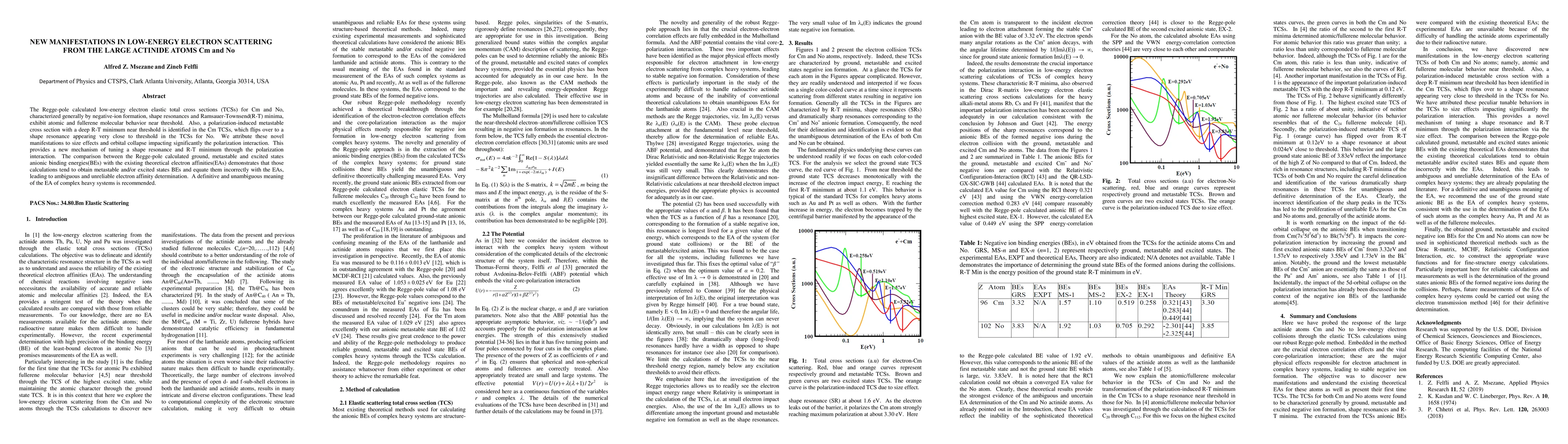 The Regge-pole calculated low-energy electron elastic total cross sections (TCSs) for Cm and No, characterized generally by negative-ion formation, shape resonances and Ramsauer-Townsend(R-T) minima, exhibit atomic and fullerene molecular behavior near threshold. Also, a polarization-induced metastable cross section with a deep R-T minimum near threshold is identified in the Cm TCSs, which flips over to a shape resonance appearing very close to threshold in the TCSs for No. We attribute these novel manifestations to size effects and orbital collapse impacting significantly the polarization interaction. This provides a new mechanism of tuning a shape resonance and R-T minimum through the polarization interaction. The comparison between the Regge-pole calculated ground, metastable and excited states anionic binding energies(BEs) with the existing theoretical electron affinities(EAs) demonstrates that those calculations tend to obtain metastable and/or excited states BEs and equate them incorrectly with the EAs, leading to ambiguous and unreliable electron affinity determination. A definitive and unambiguous meaning of the EA of complex heavy systems is recommended.