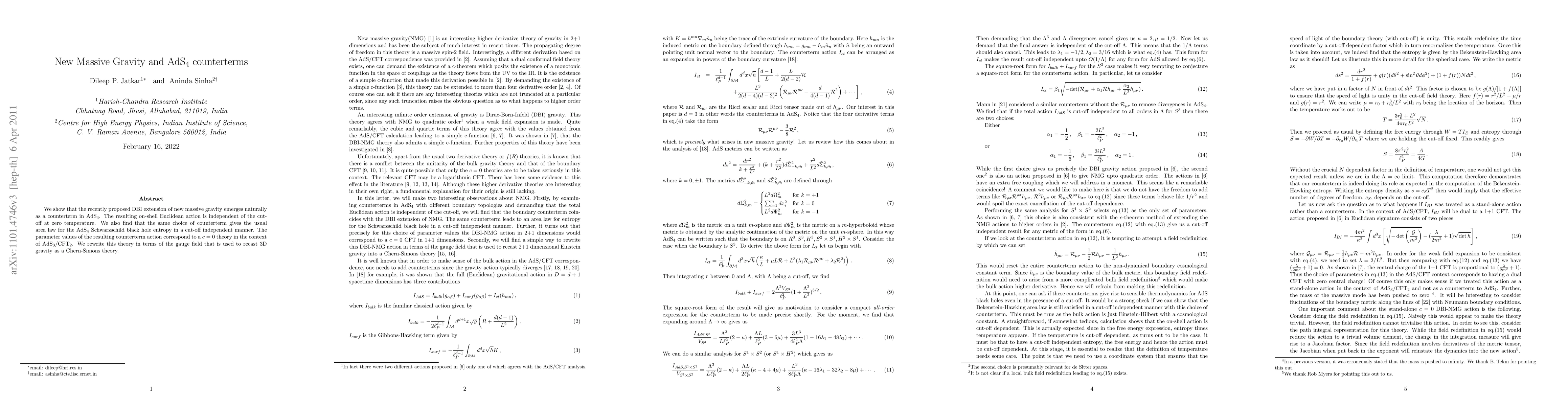 We show that the recently proposed DBI extension of new massive gravity emerges naturally as a counterterm in AdS$_4$. The resulting on-shell Euclidean action is independent of the cut-off at zero temperature. We also find that the same choice of counterterm gives the usual area law for the AdS$_4$ Schwarzschild black hole entropy in a cut-off independent manner. The parameter values of the resulting counterterm action correspond to a $c=0$ theory in the context of AdS$_3$/CFT$_2$. We rewrite this theory in terms of the gauge field that is used to recast 3D gravity as a Chern-Simons theory.