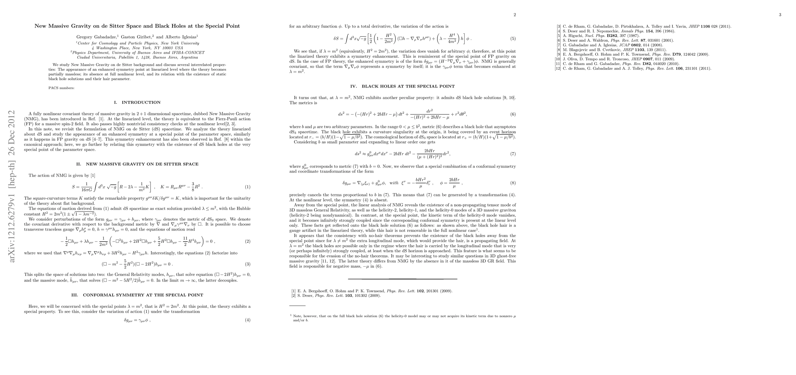 Summary: This paper investigates New Massive Gravity on de Sitter space, highlighting the emergence of a partially massless symmetry at the linearized level, its absence at full nonlinearity, and its connection to static black hole solutions and their associated hair parameters.