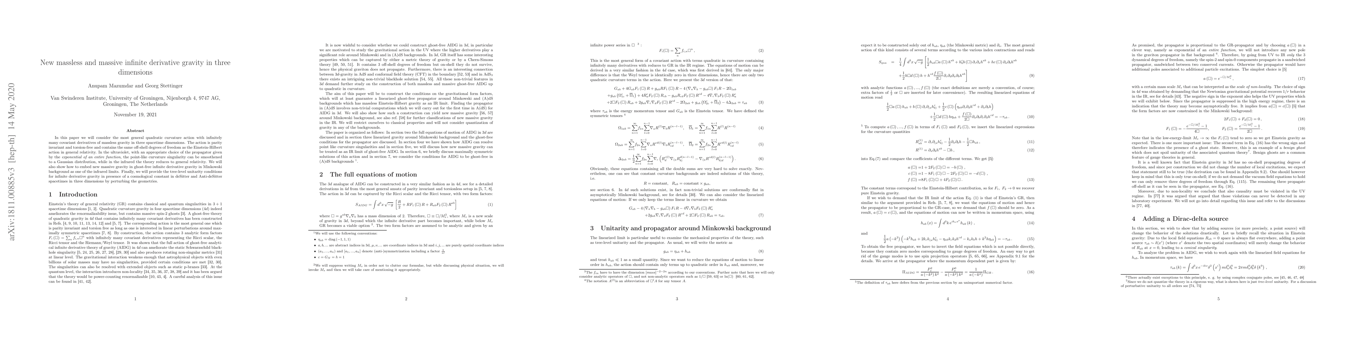 In this paper we will consider the most general quadratic curvature action with infinitely many covariant derivatives of massless gravity in three spacetime dimensions. The action is parity invariant and torsion-free and contains the same off-shell degrees of freedom as the Einstein-Hilbert action in general relativity. In the ultraviolet, with an appropriate choice of the propagator given by the exponential of an entire function, the point-like curvature singularity can be smoothened to a Gaussian distribution, while in the infrared the theory reduces to general relativity. We will also show how to embed new massive gravity in ghost-free infinite derivative gravity in Minkowski background as one of the infrared limits. Finally, we will provide the tree-level unitarity conditions for infinite derivative gravity in presence of a cosmological constant in deSitter and Anti-deSitter spacetimes in three dimensions by perturbing the geometries.