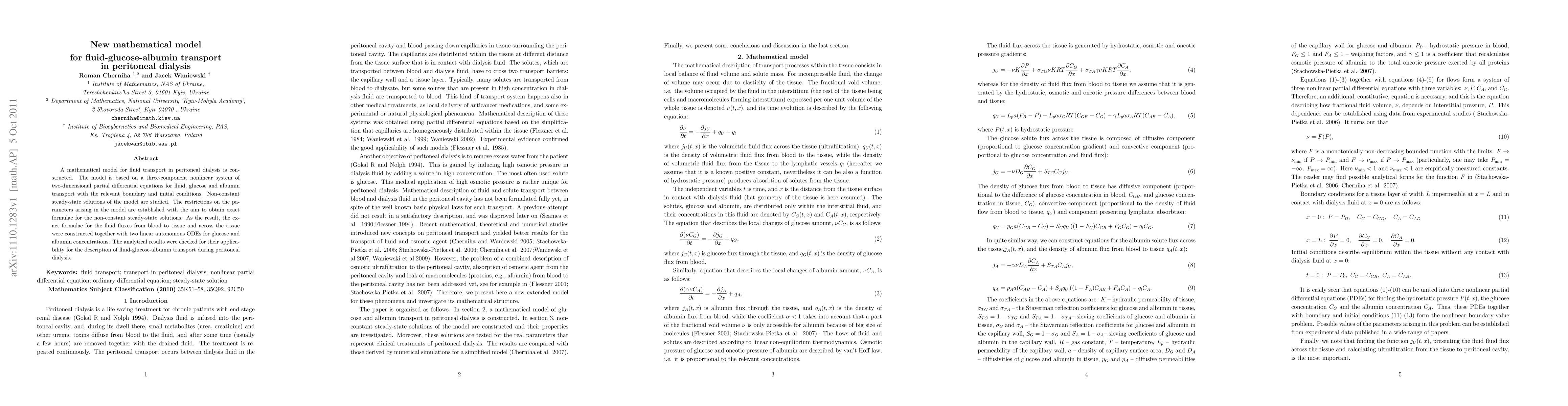 This paper constructs a mathematical model for fluid, glucose, and albumin transport in peritoneal dialysis using a three-component nonlinear system of partial differential equations. The study derives exact formulae for non-constant steady-state solutions and linear ODEs for glucose and albumin concentrations, validating the model's applicability in describing transport processes during dialysis.