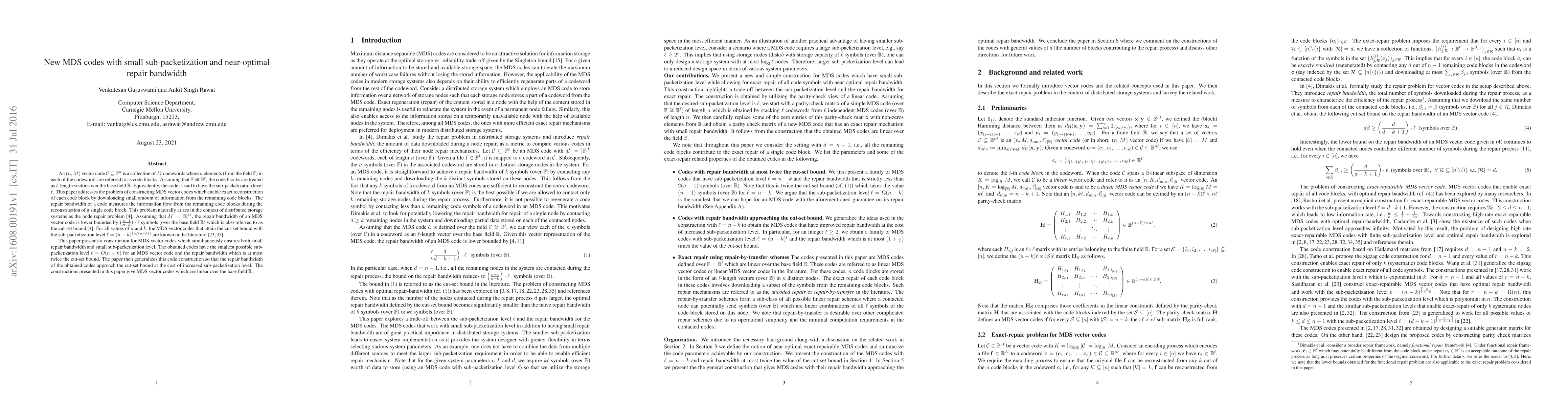 This paper constructs new MDS vector codes achieving small sub-packetization levels and near-optimal repair bandwidth, offering linear codes that minimize both the repair bandwidth and sub-packetization level, while generalizing the approach to approach the optimal repair bandwidth at the expense of higher sub-packetization.