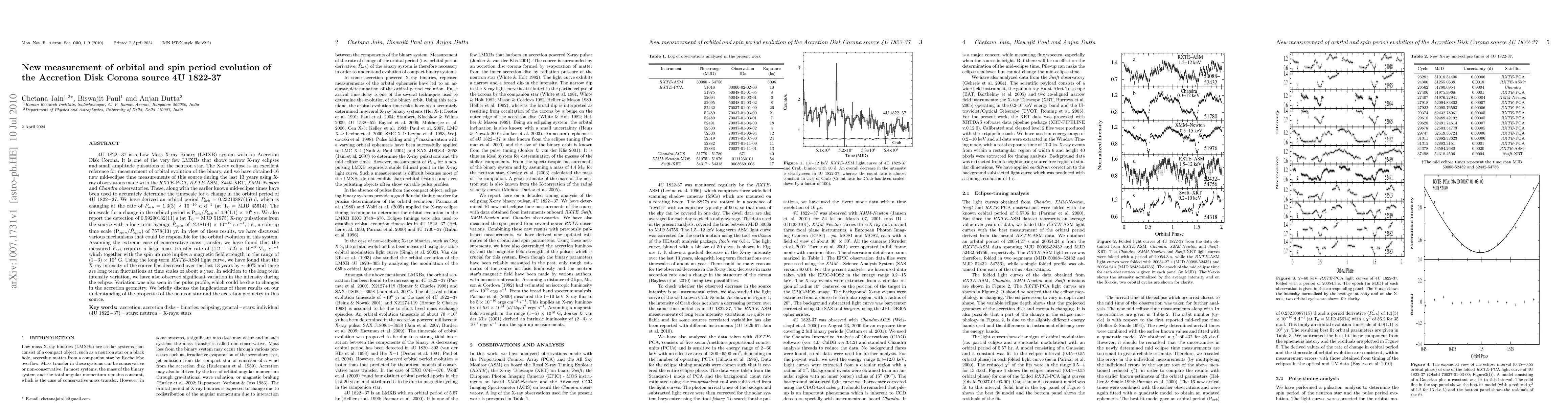 4U 1822-37 is a Low Mass X-ray Binary (LMXB) system with an Accretion Disk Corona. We have obtained 16 new mid-eclipse time measurements of this source during the last 13 years using X- ray observations made with the RXTE-PCA, RXTE-ASM, Swift-XRT, XMM-Newton and Chandra observatories. These, along with the earlier known mid-eclipse times have been used to accurately determine the timescale for a change in the orbital period of 4U 1822-37. We have derived an orbital period Porb = 0.23210887(15) d, which is changing at the rate of \cdot Porb = 1.3(3) x 10-10 d d-1 (at T0 = MJD 45614). The timescale for a change in the orbital period is Porb/ \cdot Porb of 4.9(1.1) x 106 yr. We also report the detection of 0.59290132(11) s (at T0 = MJD 51975) X-ray pulsations from the source with a long term average \cdot Pspin of -2.481(4) x 10-12 s s-1, i.e., a spin-up time scale (Pspin/ \cdot Pspin) of 7578(13) yr. In view of these results, we have discussed various mechanisms that could be responsible for the orbital evolution in this system. Assuming the extreme case of conservative mass transfer, we have found that the measured \cdot Porb requires a large mass transfer rate of (4.2 - 5.2) x 10-8 M\odot yr-1 which together with the spin up rate implies a magnetic field strength in the range of (1-3) x 108 G. Using the long term RXTE-ASM light curve, we have found that the X-ray intensity of the source has decreased over the last 13 years by ? 40% and there are long term fluctuations at time scales of about a year. In addition to the long term intensity variation, we have also observed significant variation in the intensity during the eclipse.